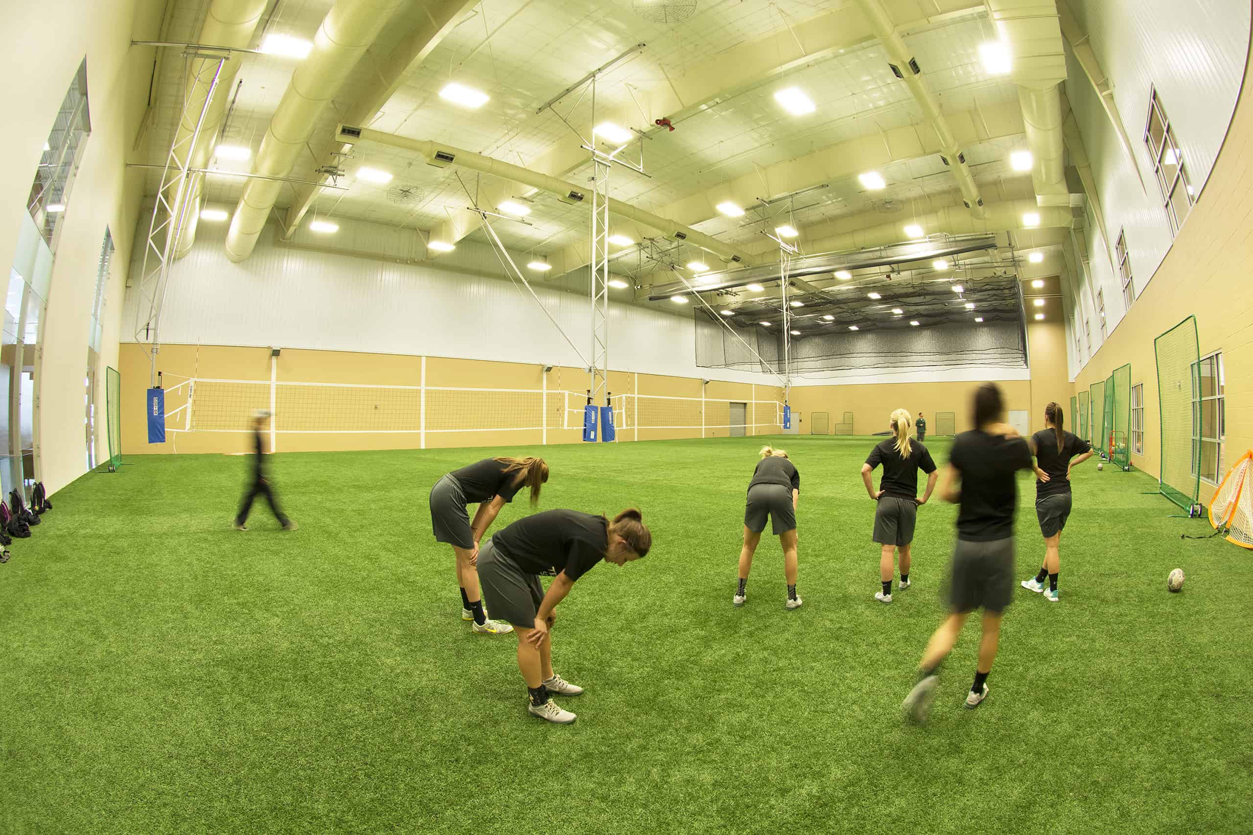 Another area includes a 40- by 60-yard indoor turf fieldhouse. This space allows teams to participate in soccer, football, and other athletic activities during the winter. It houses two dedicated and four retractable batting cages.