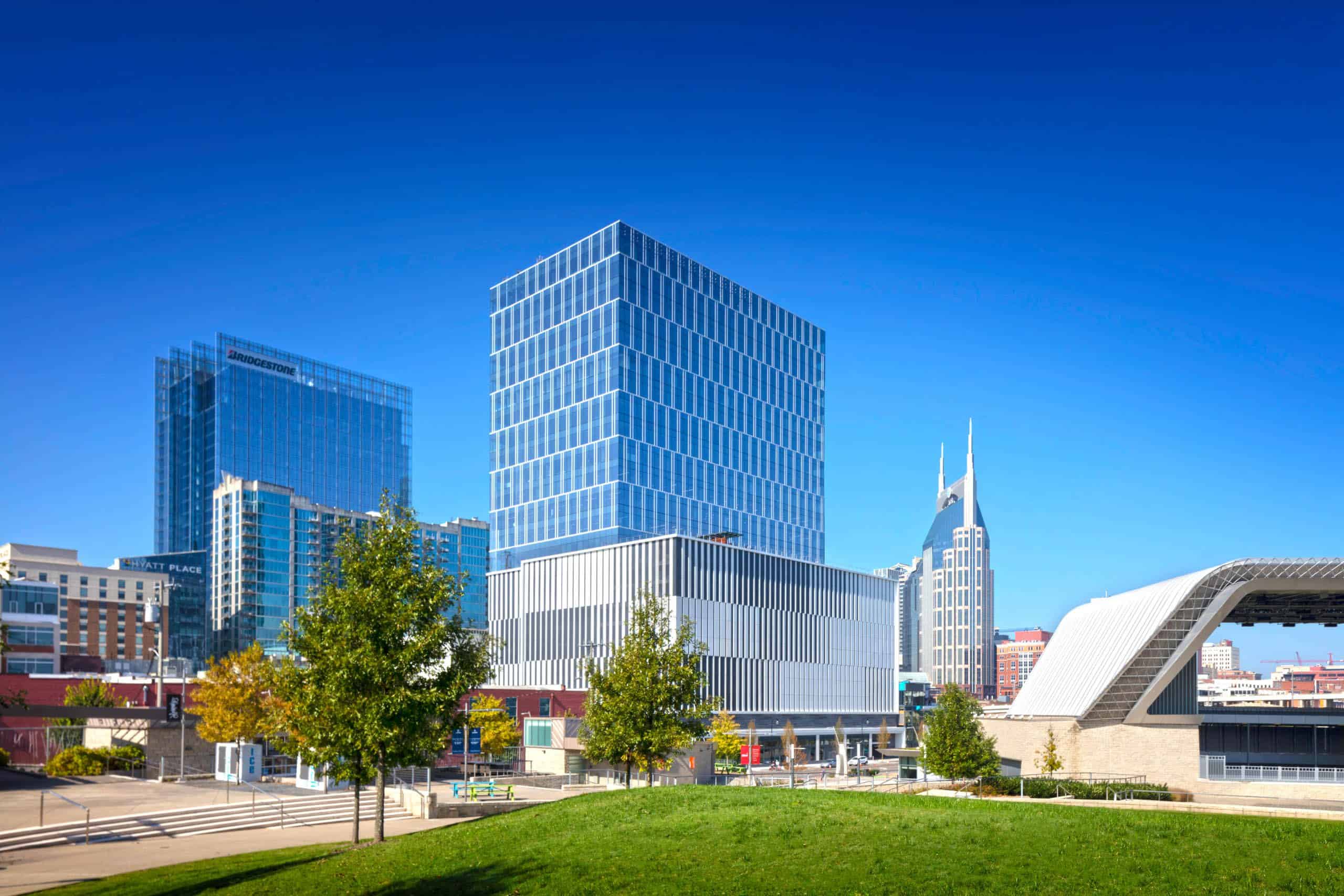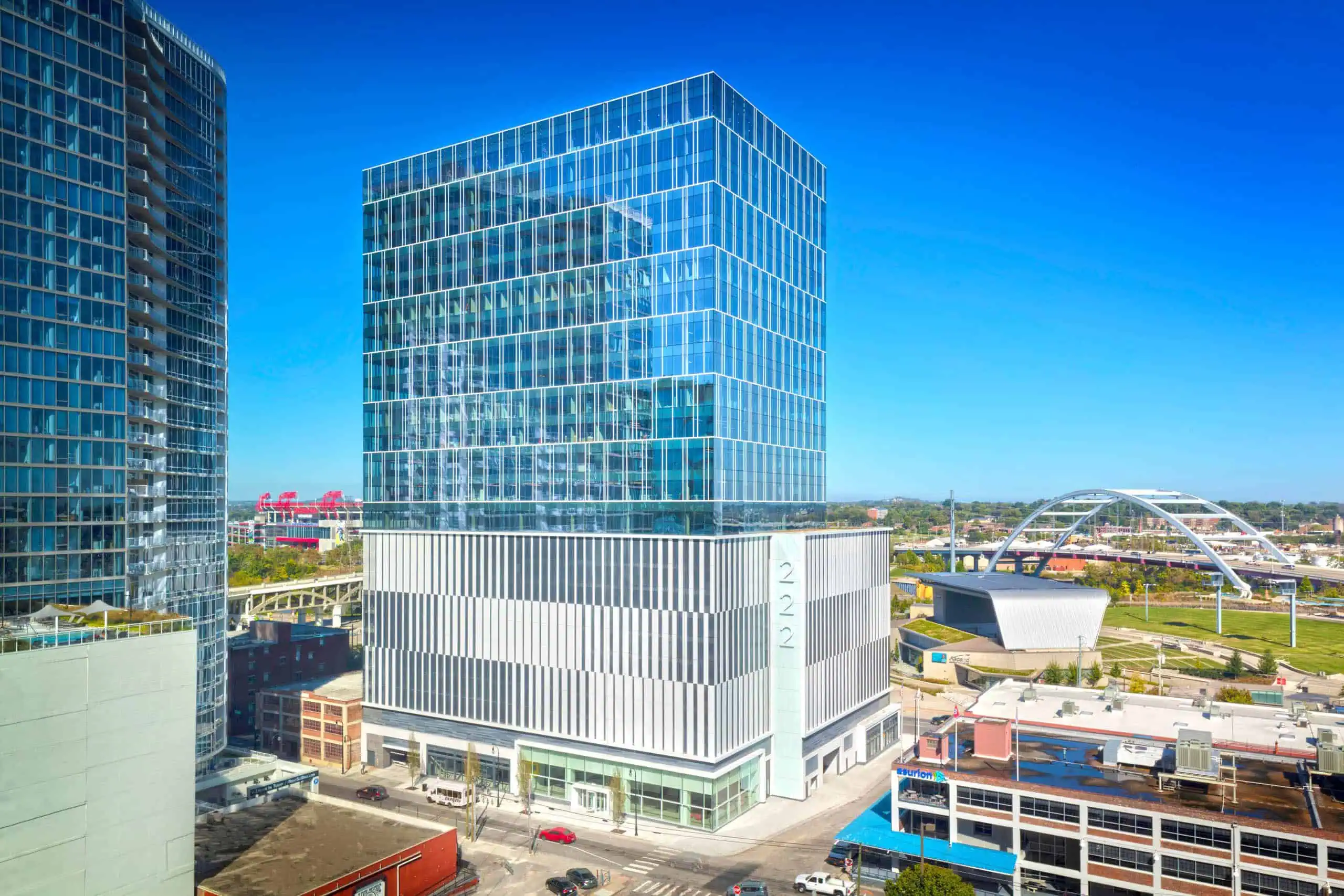 Located in the heart of downtown Nashville, 222 is a 26-story office building that features a total of 818,500 square feet – 390,000 of core/shell space, 32,000 square feet of first-floor retail space, and 1,100 space parking garage. The exterior of the building consists of metal paneling on the garage levels, and curtain wall for the tower. On the ground level, storefront glass and brick make for an intricate mix of the façade of the building.