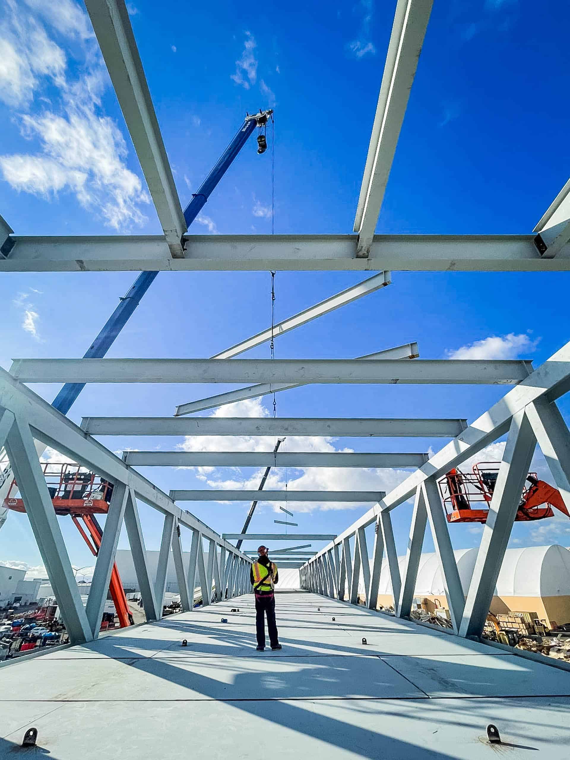 JE Dunn constructed a 25,000 square feet elevated, enclosed bridge structure for manufacturing line conveying equipment. The fully enclosed structural steel conveyance platform spans nearly 600 feet to connect two existing manufacturing buildings and was constructed in three phases. Construction took place on an occupied campus with active semi-truck and forklift traffic and adjacent to buildings housing 24/7 production lines. Careful planning and close coordination with the owner occurred months in advance to create a logistics plan that took construction space requirements and manufacturing production impact mitigation into consideration.