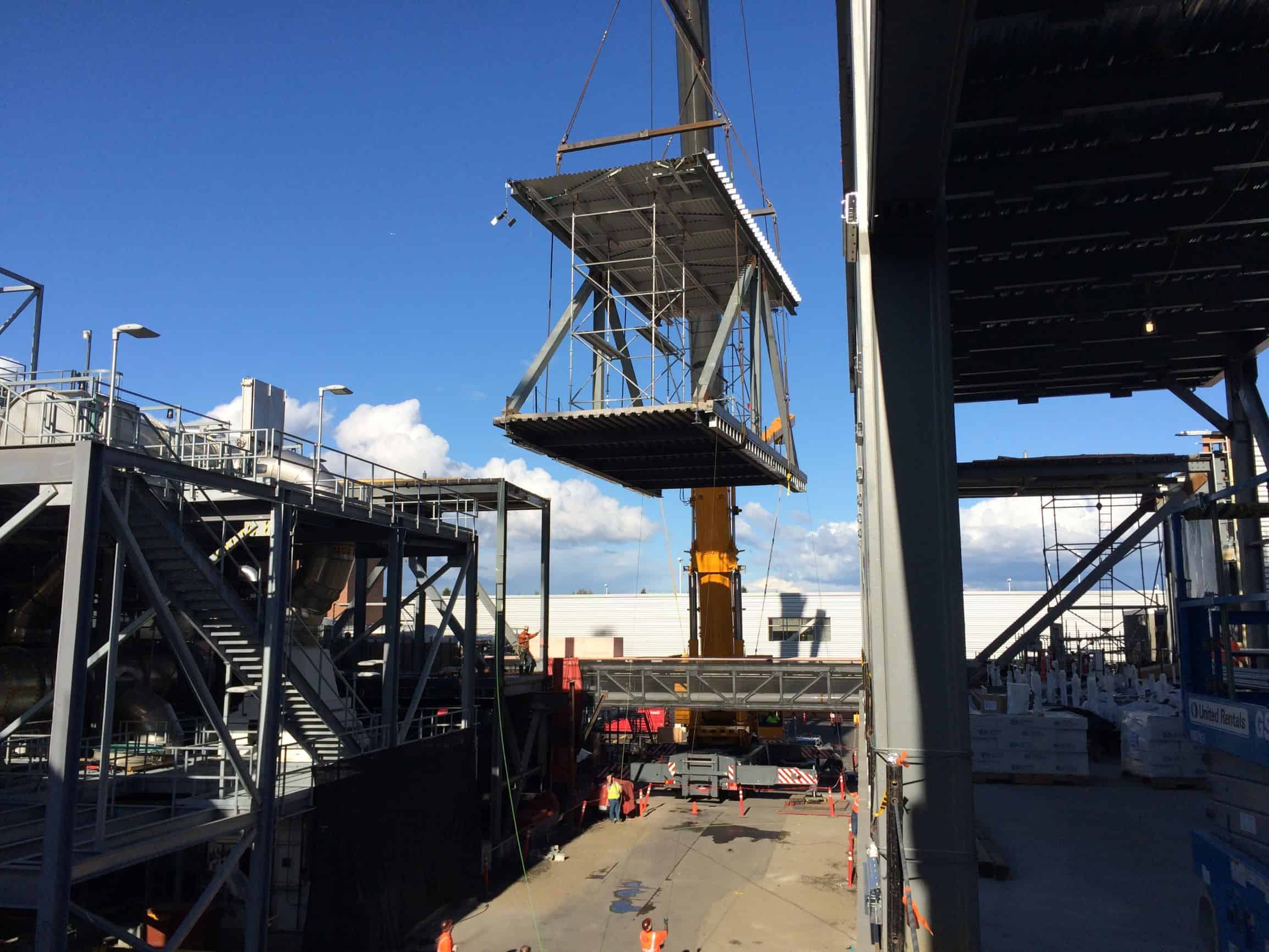When we think of modularization, we often think of constructing something in sections or units. In the case of a recent semiconductor project, the modularization approach was applied in the opposite way— for demolition. An old utility link structure needed to be demolished to clear the path for a new clean link connecting two Fab facilities. Instead of demolishing the link piece by piece in the elevated location, our team developed a PtD approach to demolish modular sections. We disconnected a module from the link and hoisted it onto the ground. Once on the ground, the construction team systematically demolished the section from safer heights and access points (pictured above).