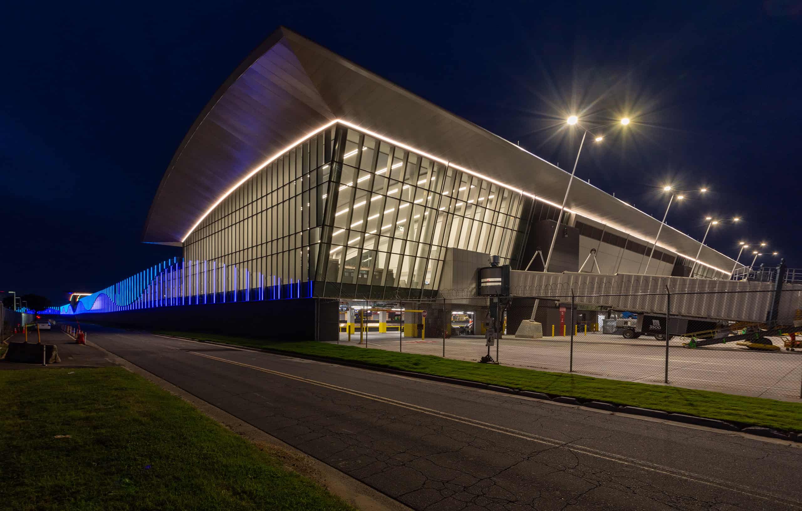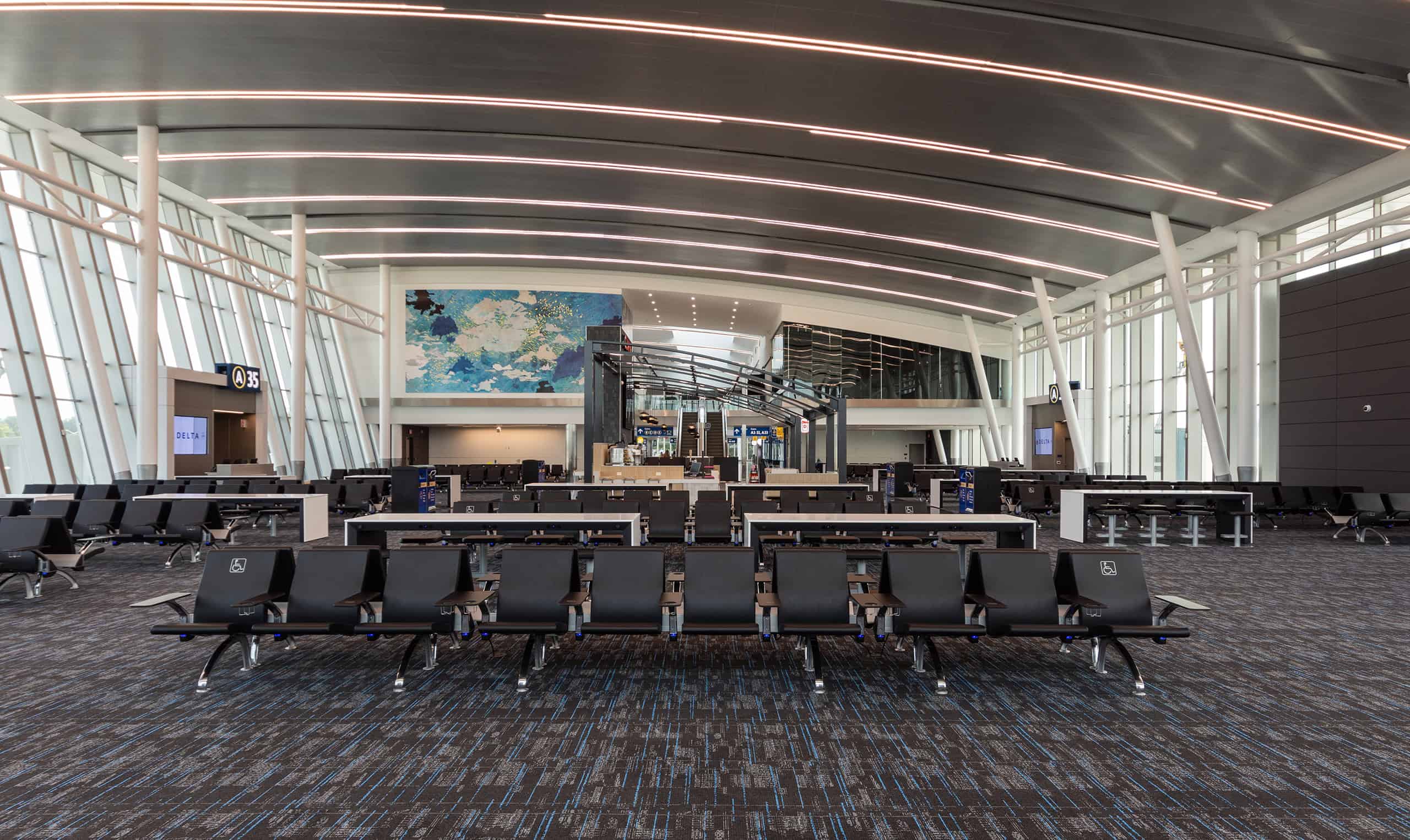 The new two-level concourse features ten gates and an upgraded baggage handling system that integrates with the existing system. Passengers benefit from an 825-foot connector equipped with moving sidewalks. The glazing system features 600 pieces of glass, each with a low-voltage driver that automatically adjusts during peak sunlight.