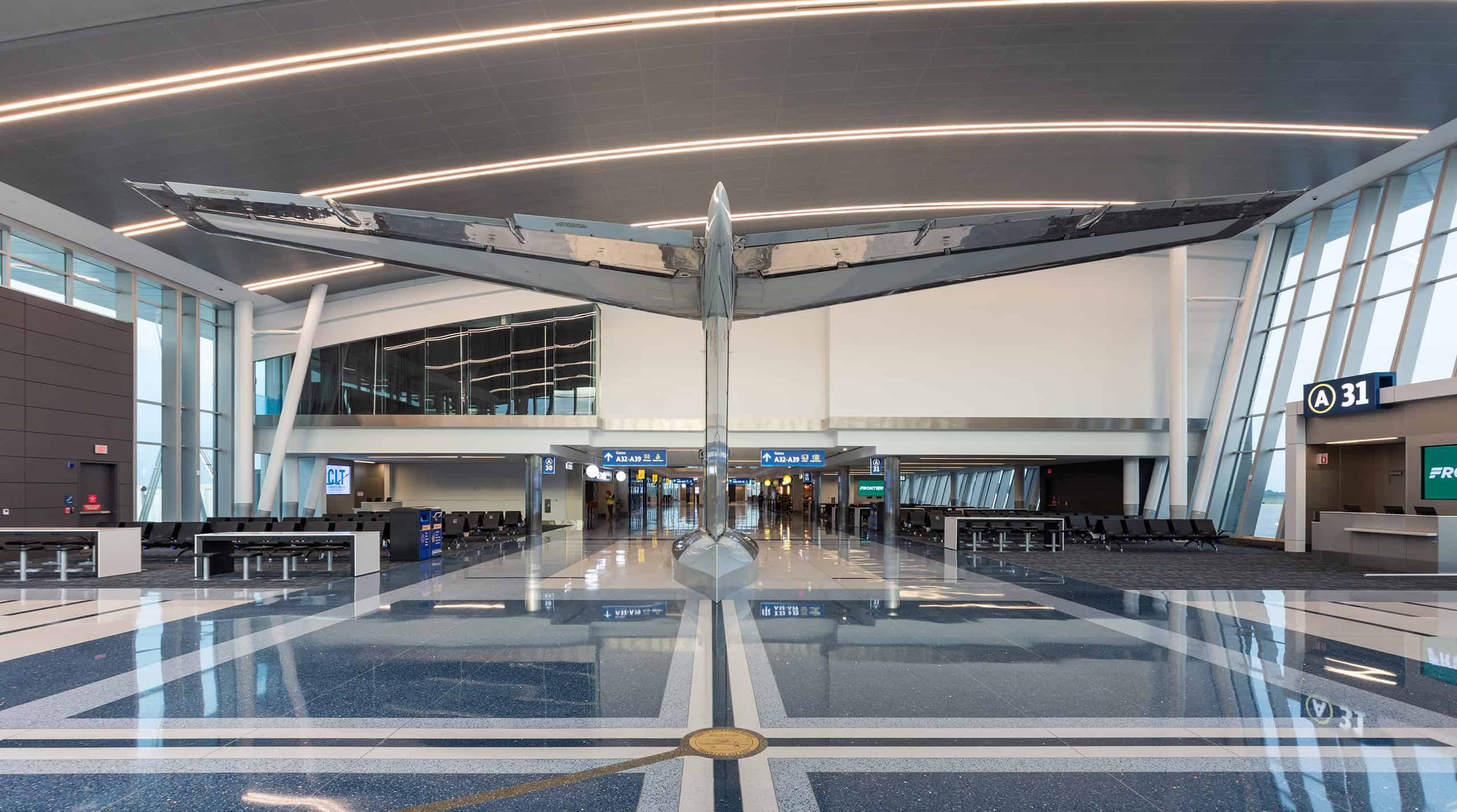 A custom terrazzo floor showcases a bronze outline of a life-size plane, while displays celebrate North Carolina’s aviation legacy, highlighted by an immersive “First in Flight” light and sound wall. A life-sized DC-9-82 T-Tail aircraft is embedded in the floor near Gate A31, adding to the visual experience.