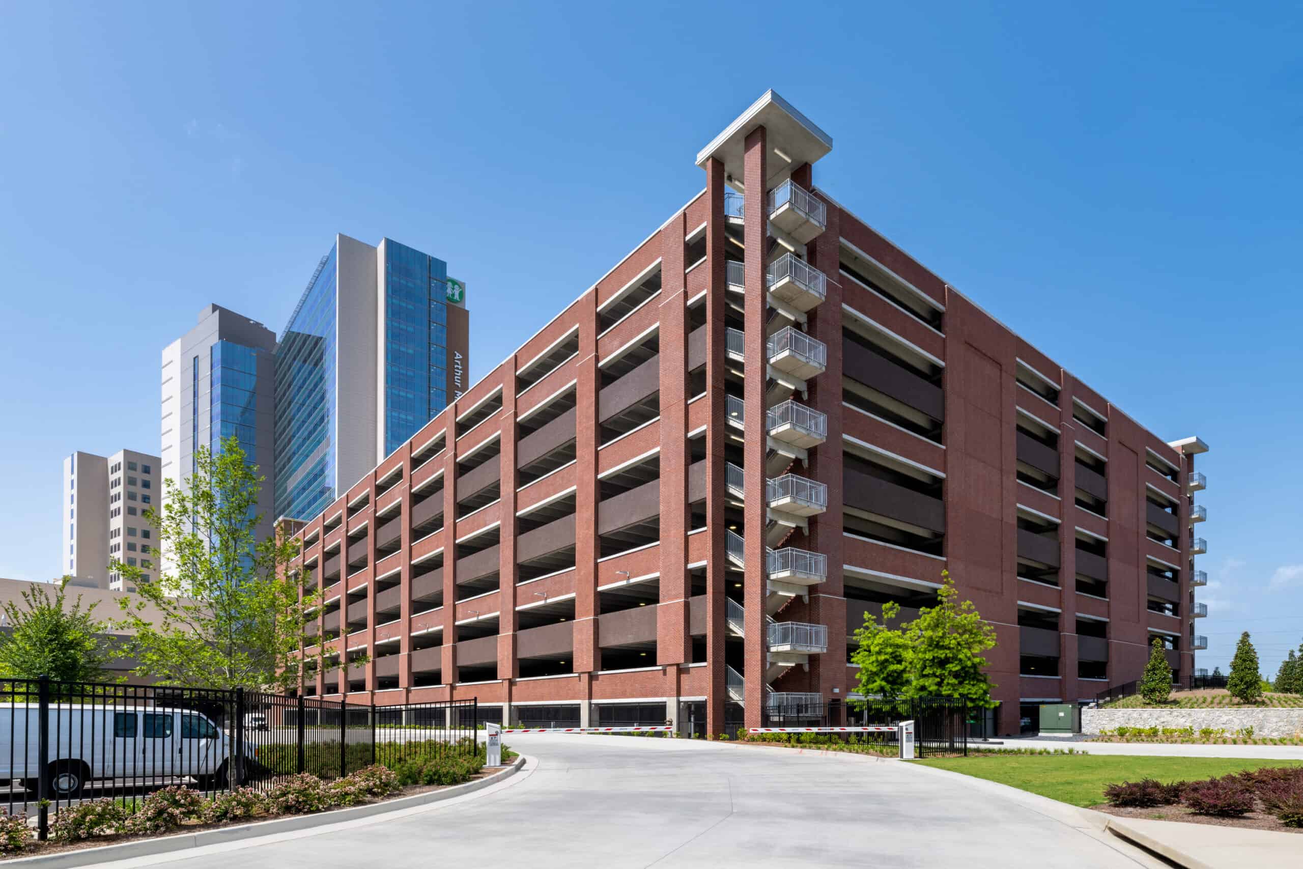 JE Dunn also delivered a 52,000-square-foot Central Utility Plant, which houses chillers, boilers, generators, medical gas systems, and bulk oxygen storage to support the entire campus. The CUP reached substantial completion in June 2022 and was operated by JE Dunn until the hospital’s turnover in 2024. JE Dunn also constructed two precast parking decks: an 8-level Visitor Parking Deck with 2,150 spaces and a 9-level Staff / Physician Parking Deck with 2,250 spaces, integrated with the hospital and clinic via pedestrian connections.
