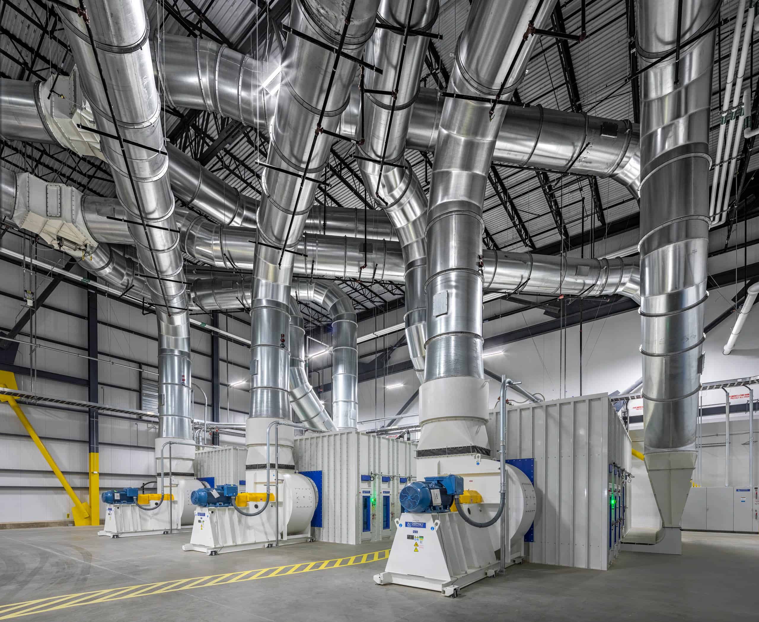 The plant includes manufacturing, warehousing, rail dock areas, maintenance shops, and a 16,000 square foot office area. The team designed and engineered a process wastewater pre-treatment system, process systems, IT and electrical infrastructure. JE Dunn managed procurement and commissioning of all infrastructure and major process equipment, including printers, compressed air with dryers, paper coating systems, conveying systems, and a trim paper collection system.