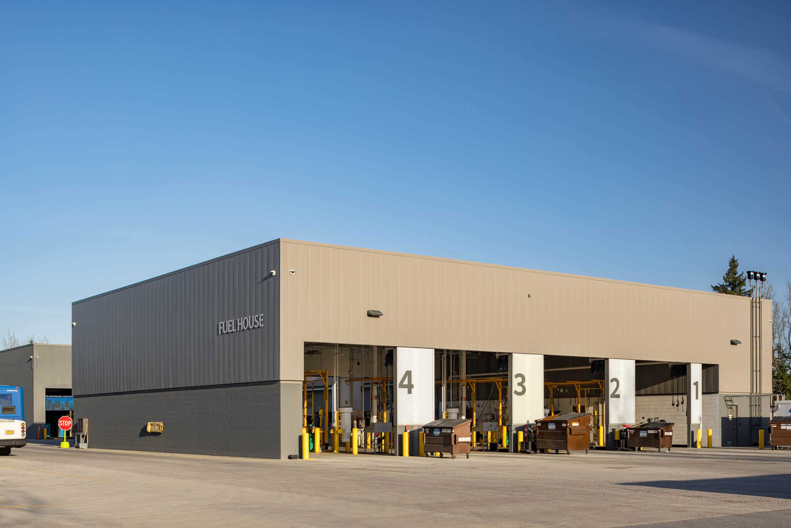 The first phase involved building a 24,000-square-foot fuel and wash building which operates a bus wash system that reclaims and treats water, allowing TriMet to recycle 300 gallons of water per minute during operation of the three new bus wash bays.