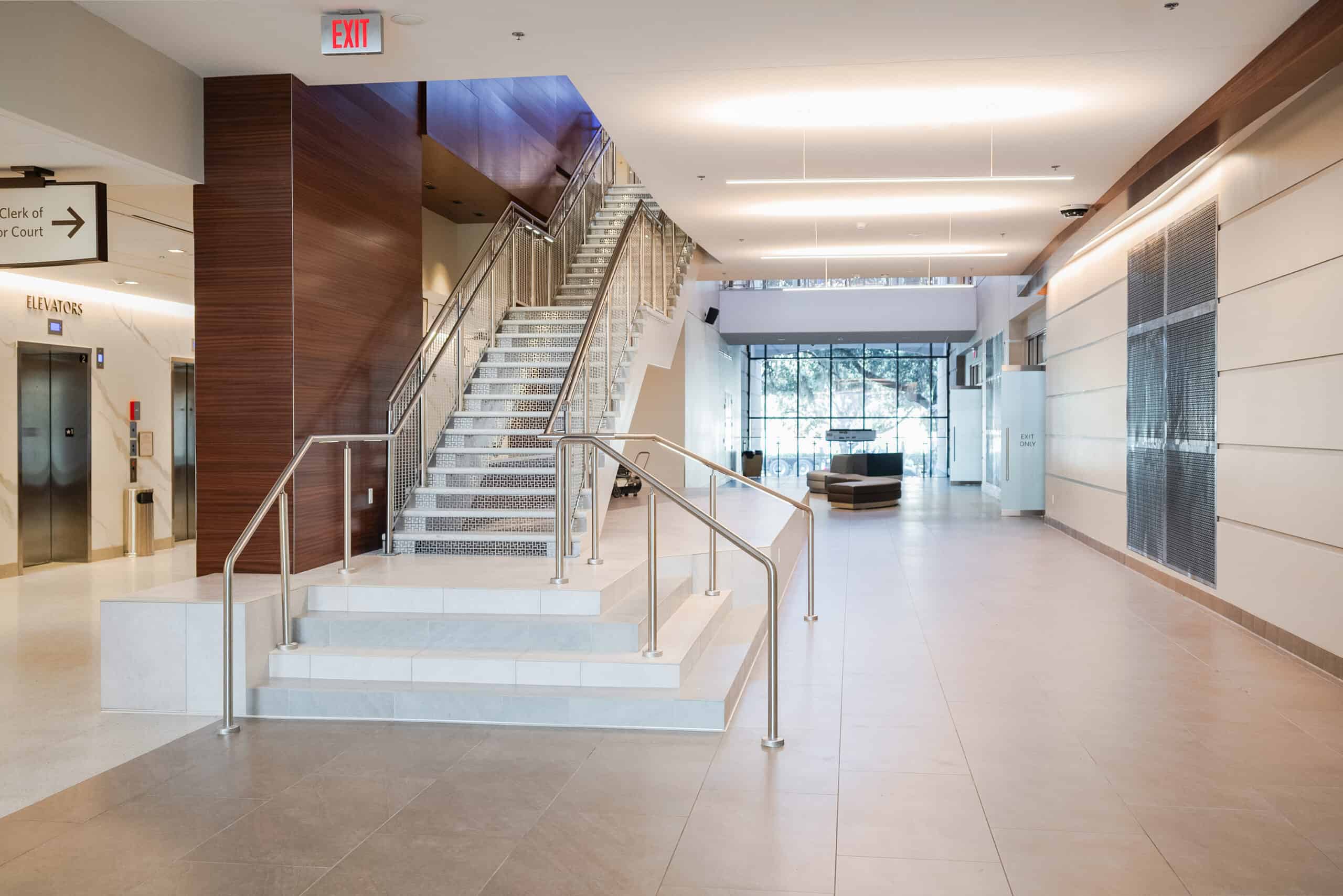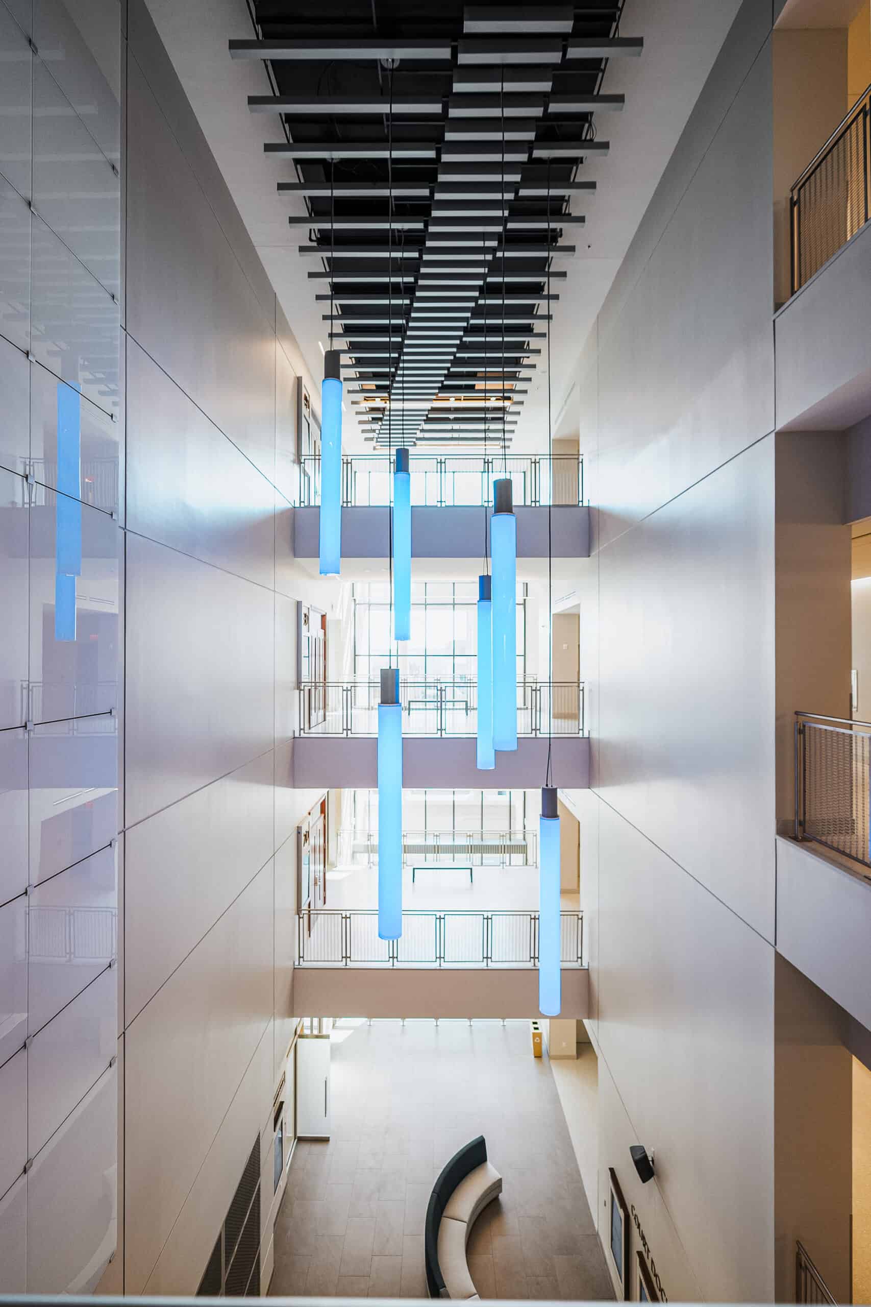 The new courthouse is designed to accommodate an inmate transfer station comprising of seven holding cells in the basement, offices, jury assembly for 187, and security at the lobby on the first floor. The second floor features a multipurpose room for 85, four state courtrooms, two 3-cell holding areas, four judge’s chambers, and administrative offices. The third floor holds offices for staff attorneys and court support, four superior courtrooms with deliberation rooms, another two 3-cell holding areas, and four additional judge’s chambers. Finally, the fourth floor houses the administrative offices of the superior court, four courtrooms each with a jury deliberation room, two 3-cell holding areas shared by the courtrooms, and four judge’s chambers and administrative offices.