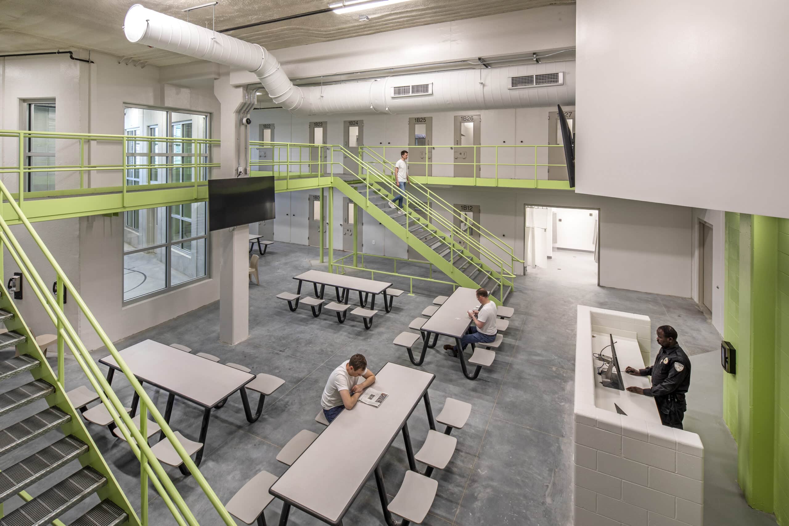The correctional facility has four unique cell types, precast concrete, precast steel, CMU (concrete masonry unit), and welded tension metal wall panel.