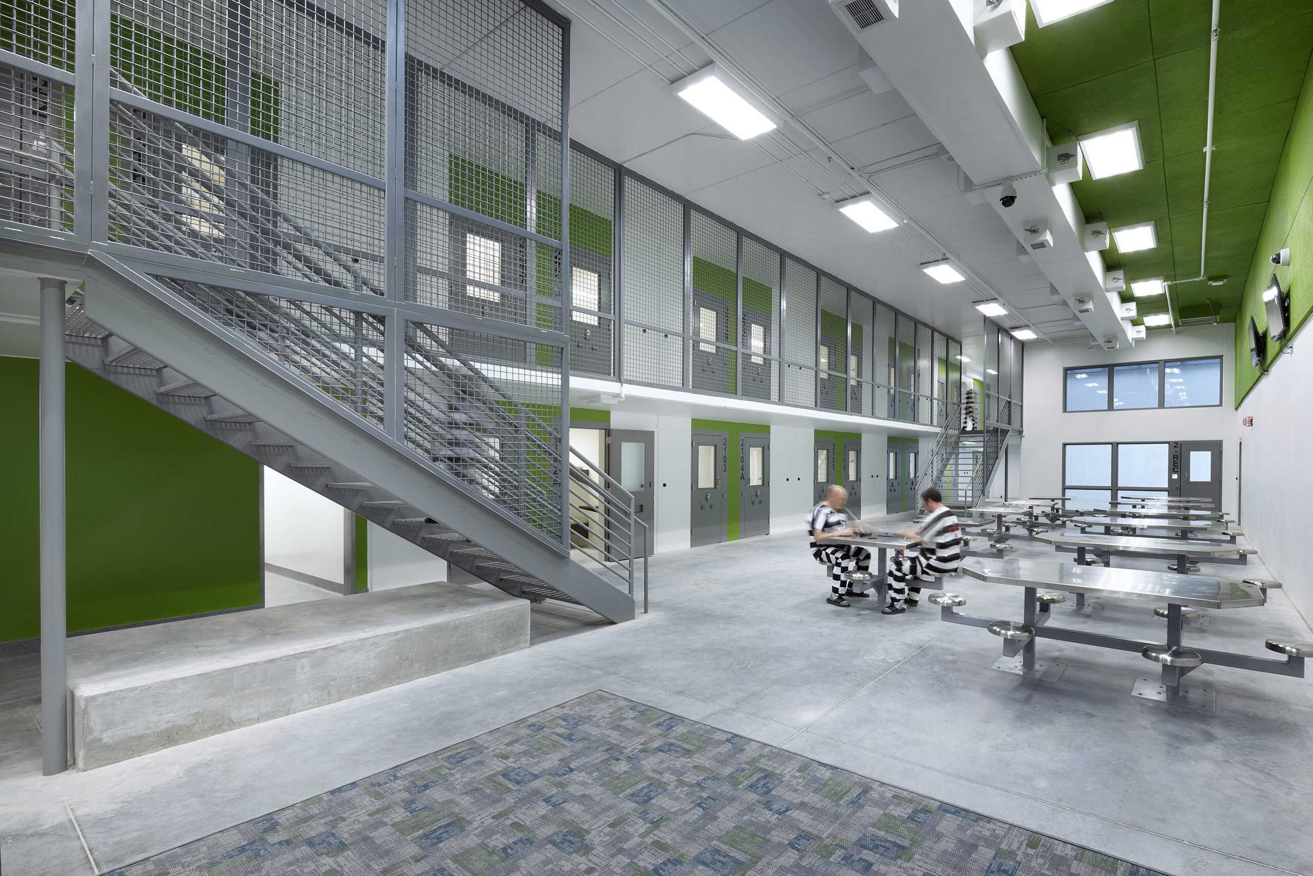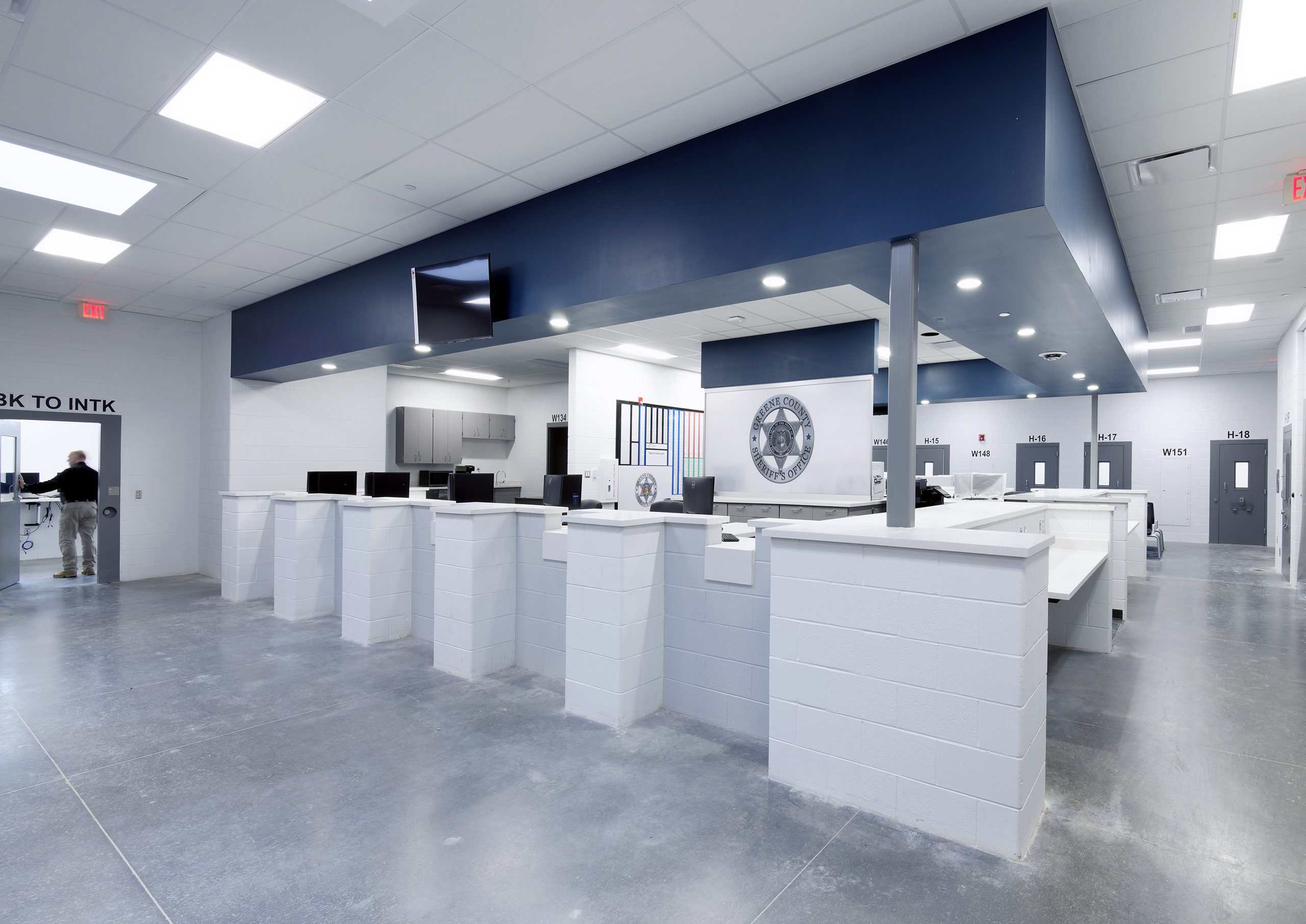 The main housing unit for inmates consists of 12 pods with 56 beds in each. Inmates on work release or work jobs inside the jail itself will be housed in four dorm-style pods with 24 people in each, and a second dorm of four pods with 50 beds each. The dorm style housing is a cost-effective approach to increase bed count. The building includes 16 video court booths, a dedicated space for inmates to attend virtual court hearings, which alleviated a budget concern of Greene County to bus inmates to their downtown courts.