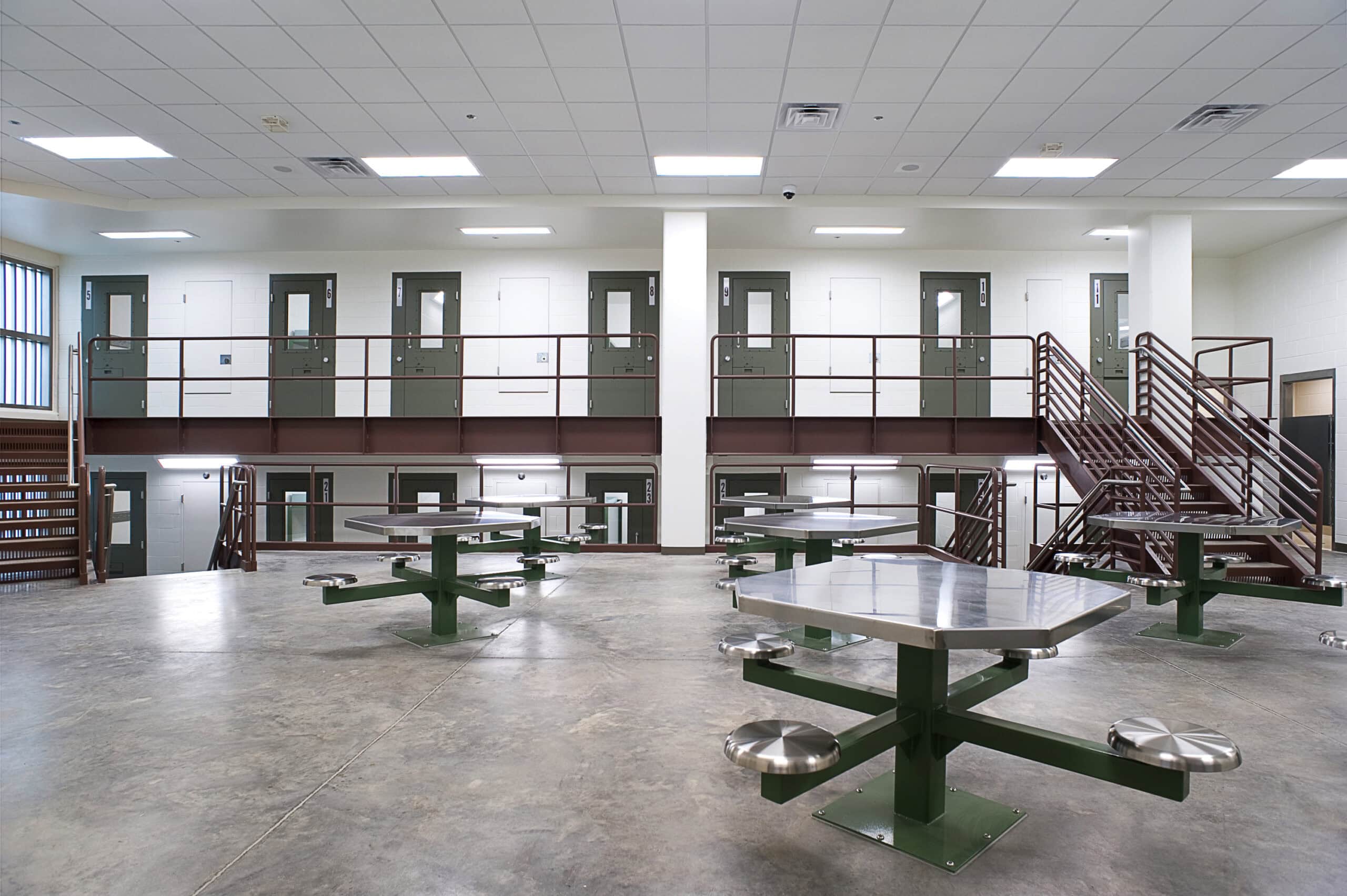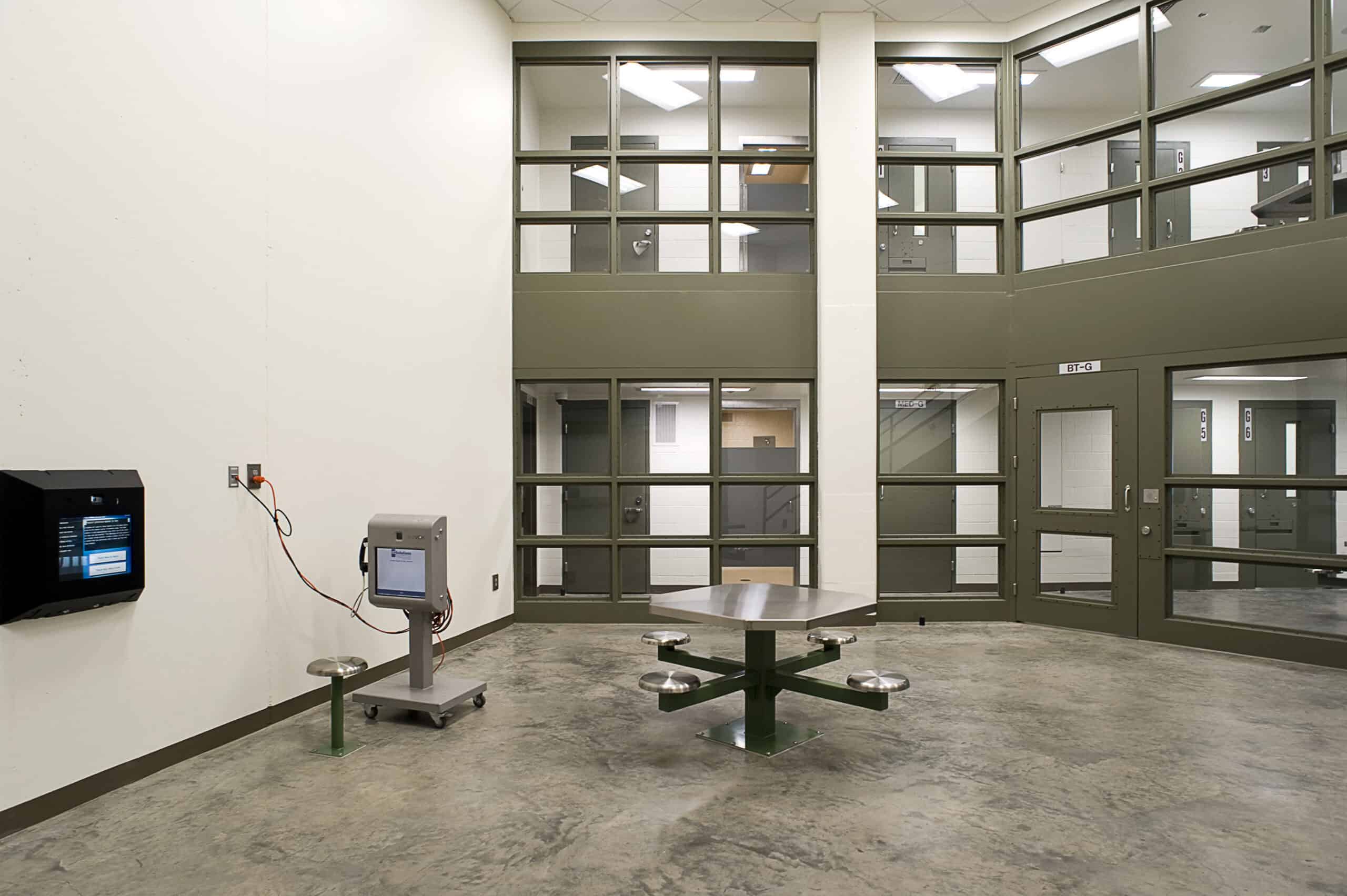 The addition creates first floor administrative services space for the jail staff, local and county police forces, and judicial branch. A 1,500-square-foot courtroom allows for in-house sentencing. The space also includes offices, conference rooms, roll-call meeting room, locker rooms, catering kitchen break room, public lobby and visitation space, and an outdoor patio. A vehicle sally port, intake area, 60 bed transitional housing, inmate recreation areas, and officer control areas are included on the new first floor. The Master Control Room was relocated to the new addition and will serve both the new facility and the existing building.