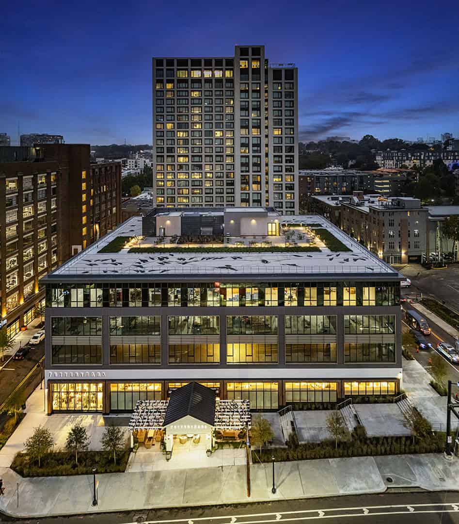 Community Connectivity: 619 Ponce Mass Timber office is one-third of the Ponce City Market Campus Upgrades build. The office building is seamlessly linked to the Scout Living project through a thoughtfully designed courtyard that separates the two buildings. On the lower-level connectivity to Ponce City Market itself can be found through the parking access with direct-to-space elevator and stair access. Rideshare drop-off spots were also implemented and bike parking for commuters.