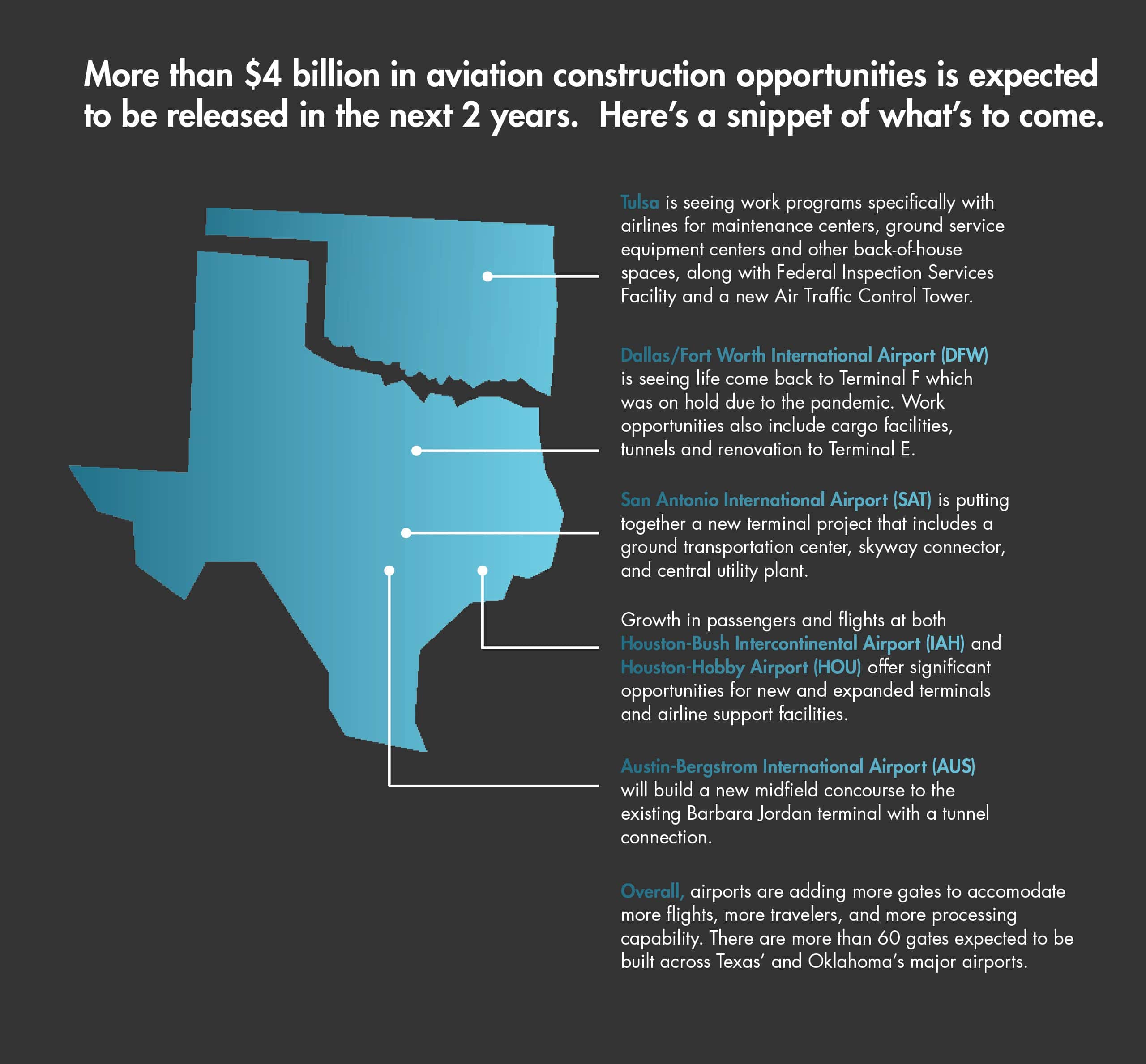The explosion of aviation work in Texas and parts of Oklahoma does include a middle ground, where airports are naturally growing with their general areas and in response to future capacity needs. This includes San Antonio International Airport and Tulsa International Airport. These individual programs are in the billions of dollars and include large, complex work that will be managed and constructed over several years.