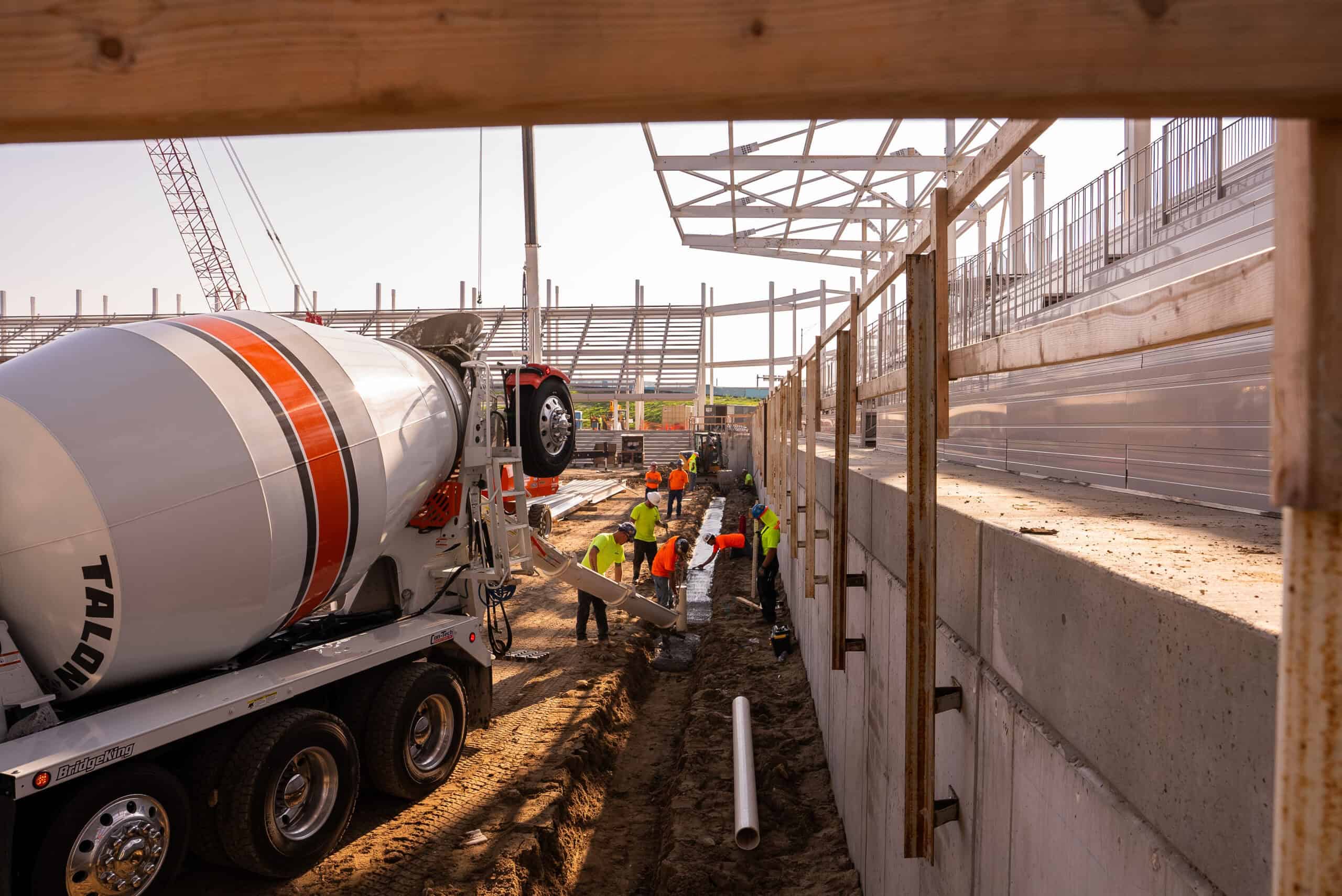 In coordinating the pitch design and fluctuating river conditions, an existing 54-inch diameter concrete storm sewer line was also discovered that needed to remain active and in place. With the line extending from one corner of the project site to the other, the project teams had to be meticulous in strategizing how to install the Auger Cast Pile (ACP) foundations supporting the stadium’s grandstand bowl structure. Foundations had to be carefully and precisely placed around the sewer line — and in many cases bridged the pipe. Lastly, leaving the sewer line in place in its current age and condition required the project team to re-line the pipe to ensure its safety and performance for years to come.