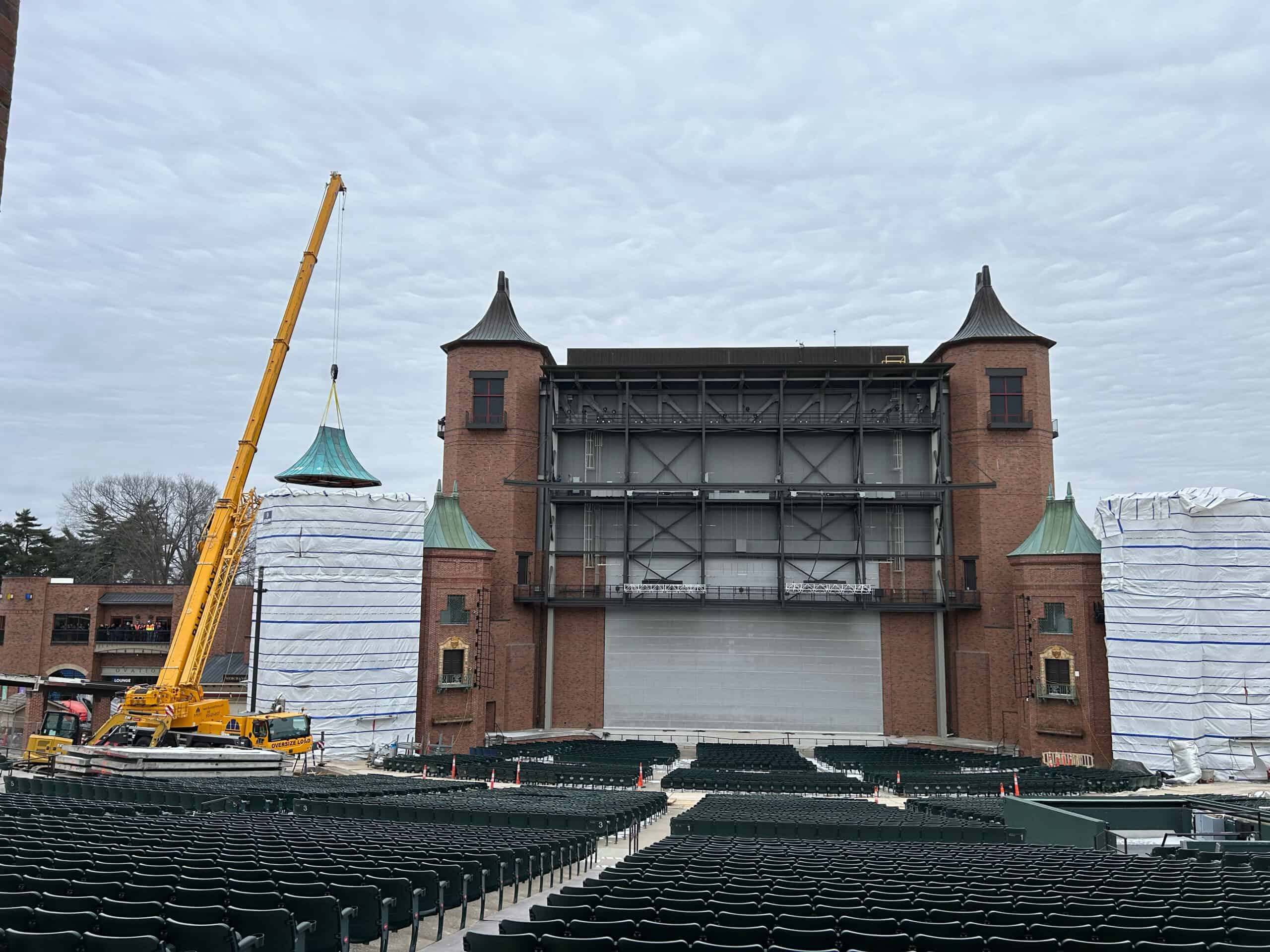 The first phase of this renovation involved constructing two nearly 70-foot-tall masonry towers that flank each side of the stagehouse, designed to replicate the exiting towers built in the 1950s. Each tower is topped with a patinated copper roof that matches the existing roof spires on the historic towers. In collaboration with Zahner, JE Dunn designed and engineered two symmetrical halves for each roof structure. The structures were clad with copper at Zahner’s offsite facility before being shipped to the jobsite, where they were assembled, hoisted into placed, and capped with a decorative spire.