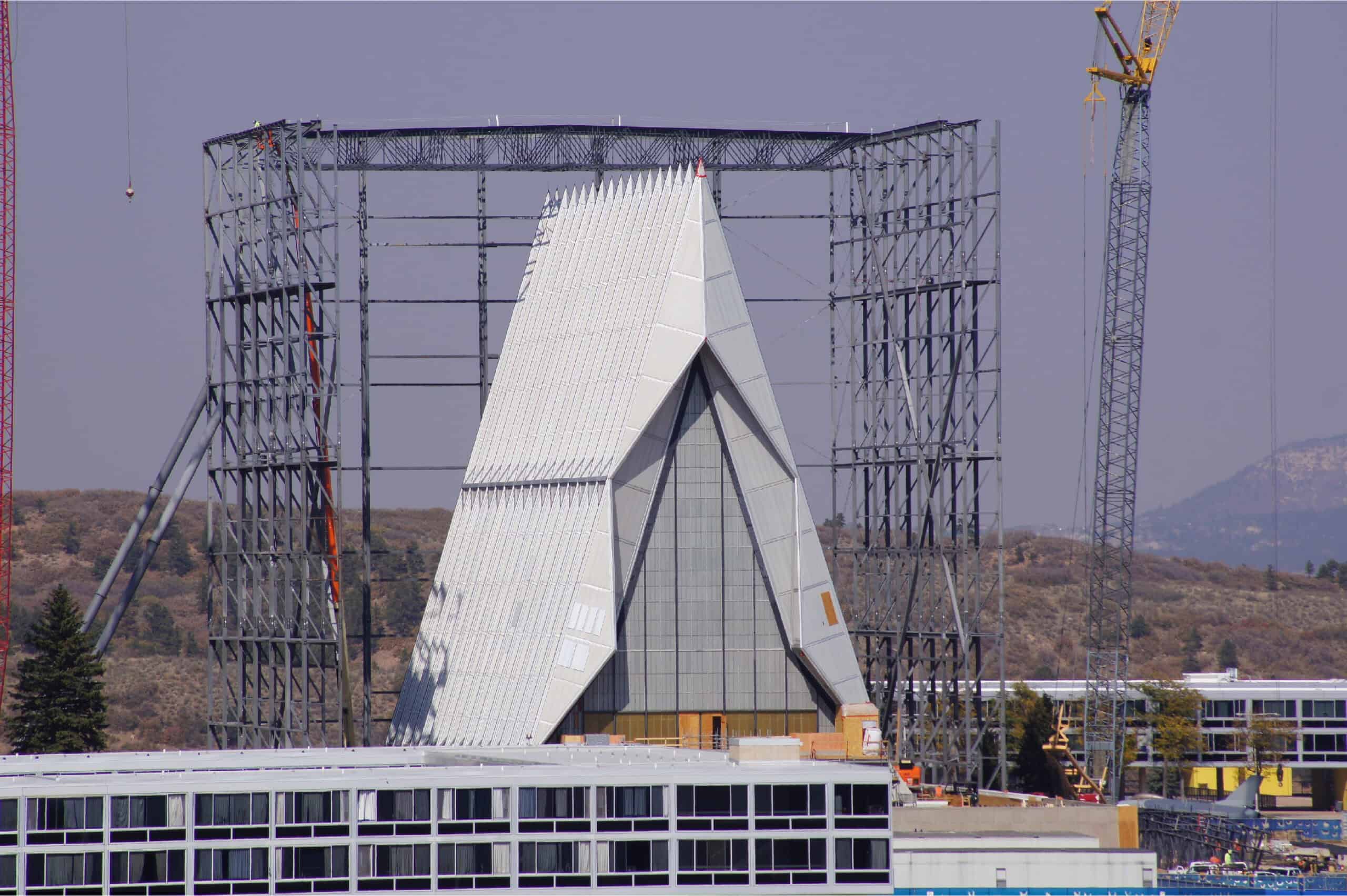 Renovation of the Historic U.S. Air Force Academy Cadet Chapel in Colorado Springs, Colorado is significant as the Cadet Chapel is considered one of the most recognized icons in the U.S. and is the most visited Colorado landmark. The Cadet Chapel was built in 1963 and designed by Skidmore, Owings and Merrill of Chicago; it was named a U.S. National Historic Landmark in 2004. It is home to six worship spaces; a 1,950-pipe organ; and a 4,518-pipe organ. The Chapel stands 150 feet tall and is most known for its 17 metal spires, or tetrahedrons, enclosed with aluminum panels and Dalle de Verre stained glass. It includes a Protestant chapel, a Catholic chapel, a Jewish synagogue, a Muslim Mosque, a Buddhist temple, and All Faiths rooms. JE Dunn constructed a super structure over the Chapel to protect the building from weather as they disassembled the structure for refurbishing. The organs, Protestant chapel pews, and stained-glass windows were removed for refurbishment, preserving all original pieces and the history of the Chapel.