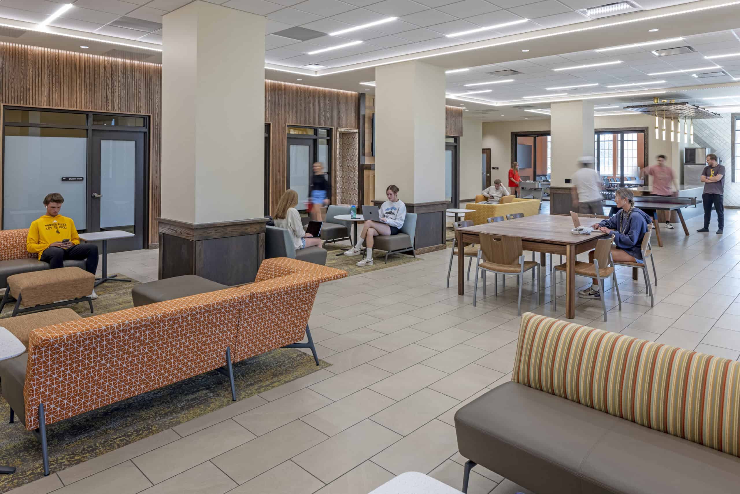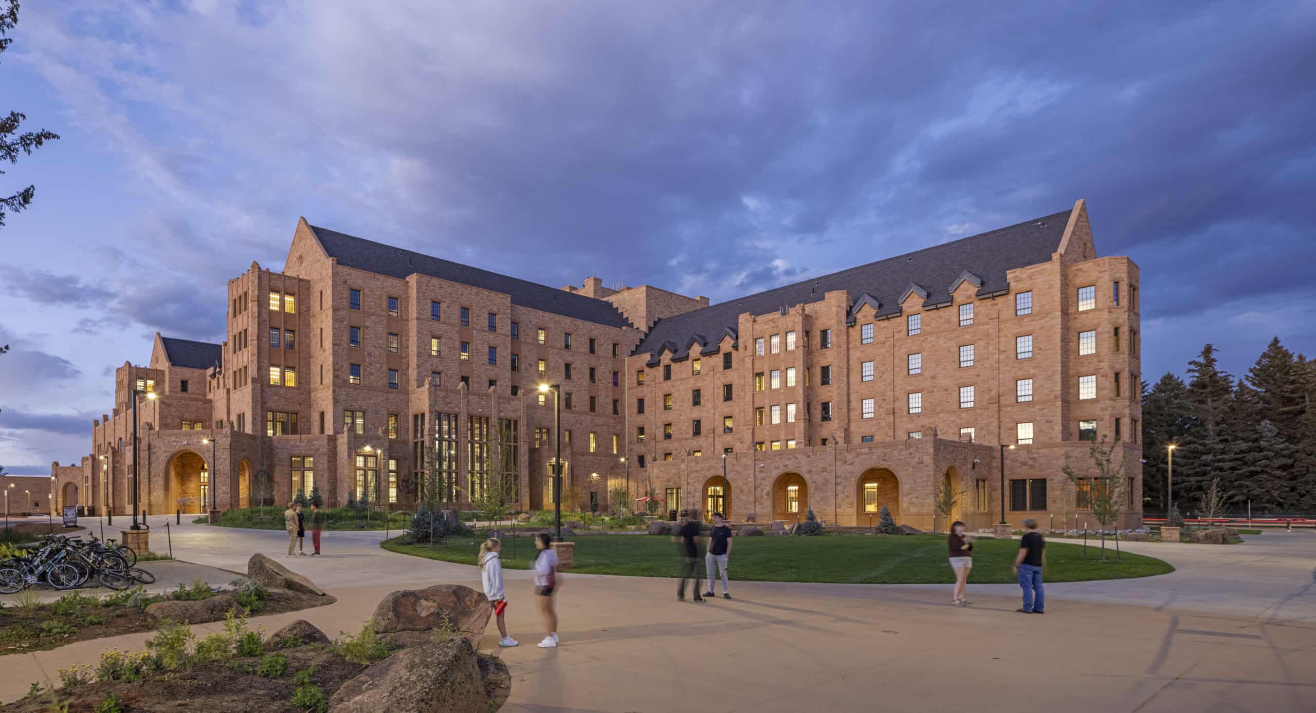 The completed North Residence Hall is a new 183,029 SF, 6-story, 220-unit student housing facility with roughly 410 beds and an 850-person student dining facility. The two-story Dining Hall, with nine serving stations that will cater to a large audience including students, faculty, staff, and Laramie residents, was designed to be a hub for campus life. The North Hall also features a deep basement level and a 12/12 pitched roof with attic space for mechanical equipment.