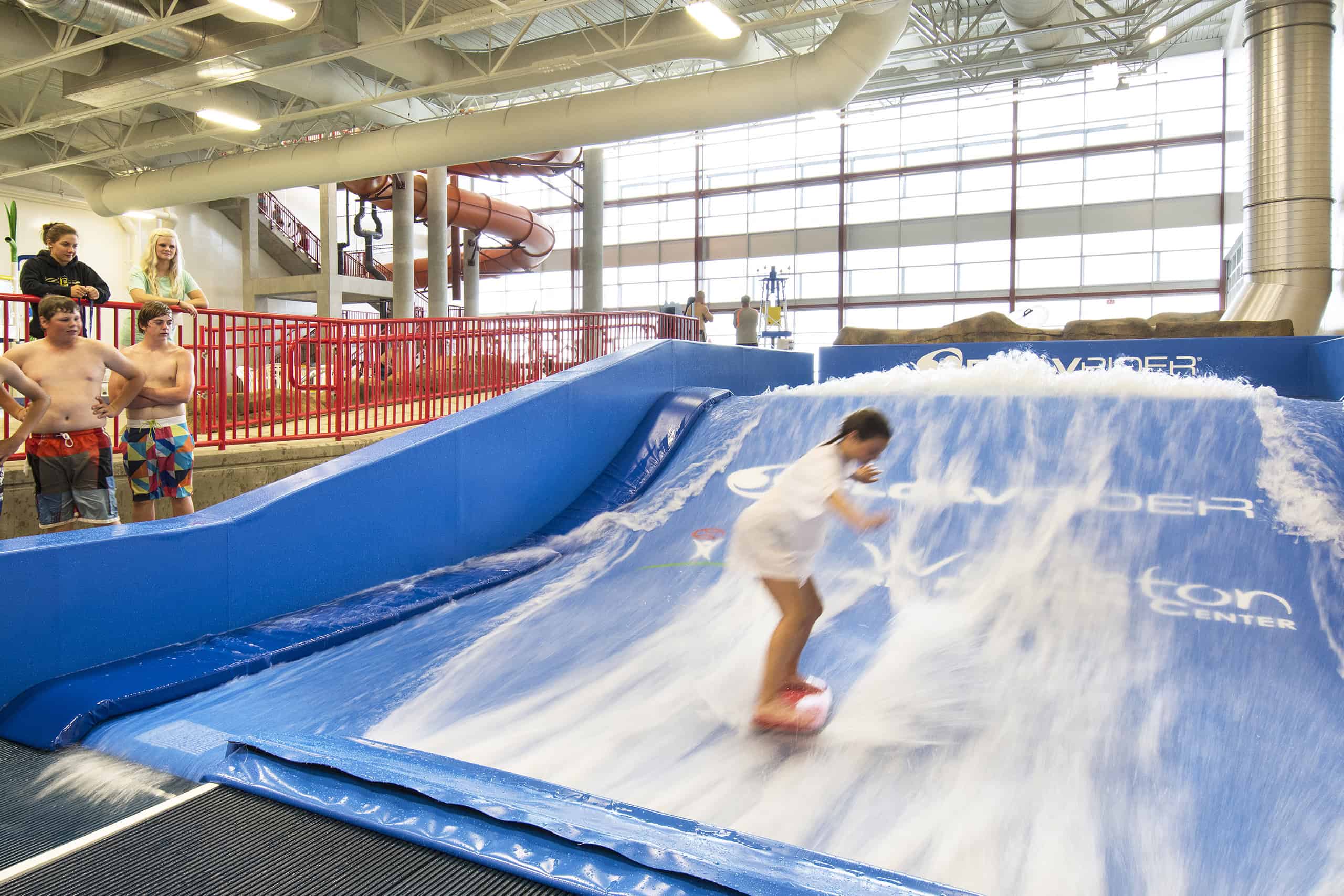 The main entrance includes a fireplace and lounge area that overlooks the water park. The pool area features a “flow rider” wave simulator, a whirlpool, and a lazy river slide. A catering kitchen is nearby for cooking classes, and an outdoor patio features a grill for cookouts during the warm months.
