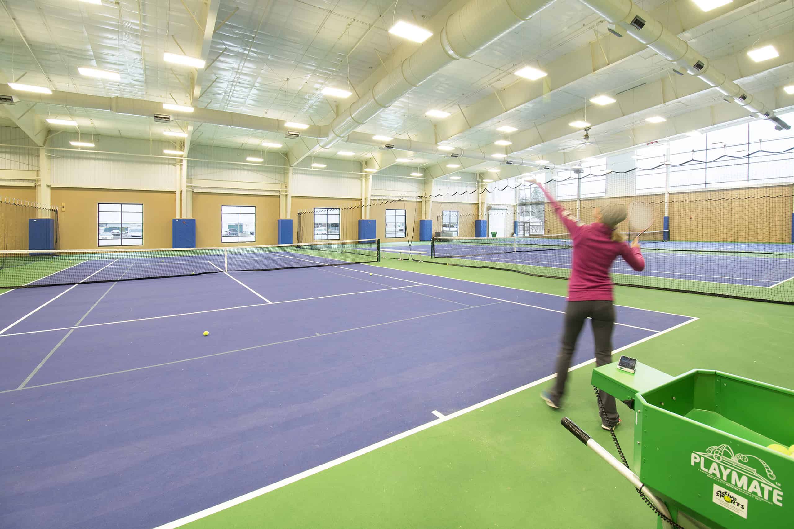 Another area includes a 40- by 60-yard indoor turf fieldhouse. This space allows teams to participate in soccer, football, and other athletic activities during the winter. It houses two dedicated and four retractable batting cages.