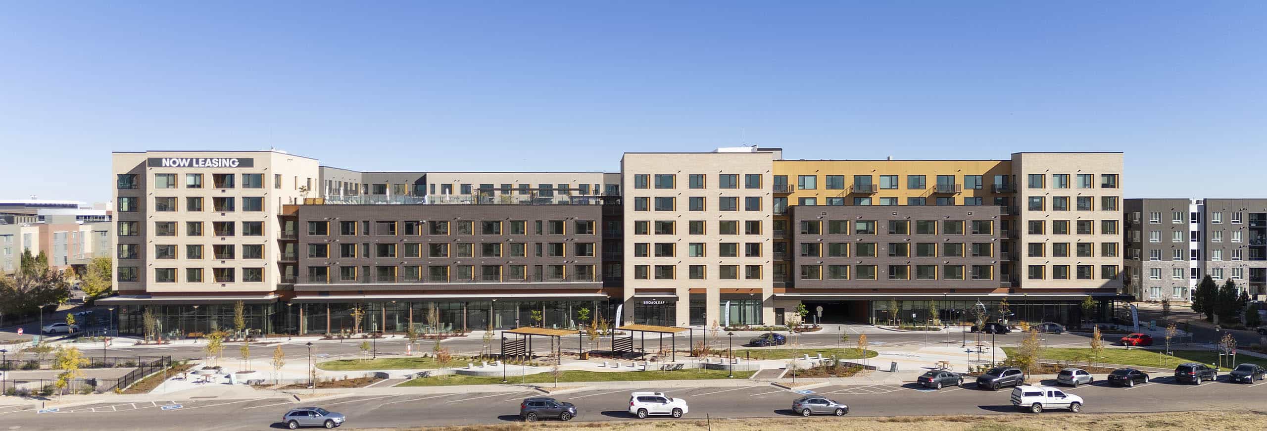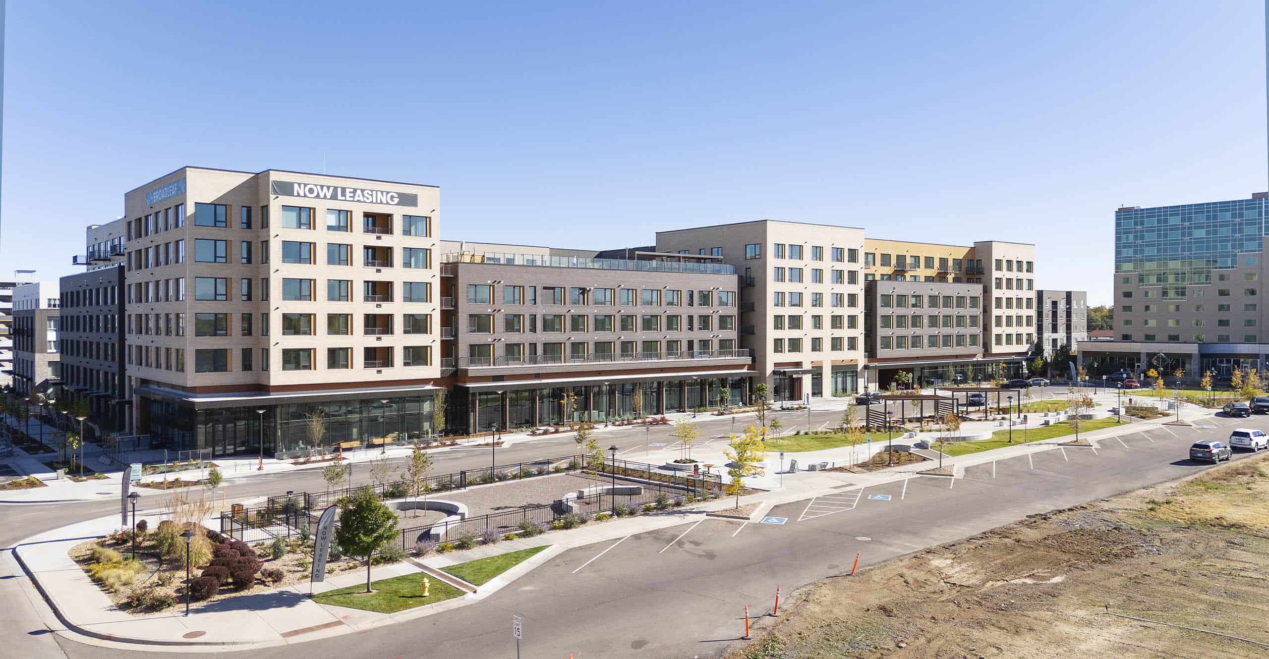 JE Dunn Construction proudly announces the completion of The Broadleaf, a premier 572,205-square-foot, seven-story mixed-use residential building in Fitzsimons Village in Aurora. As the tallest residential building in the area, The Broadleaf sets a new standard for urban living, blending luxury apartments with vibrant retail spaces in the heart of Aurora’s medical and research epicenter.