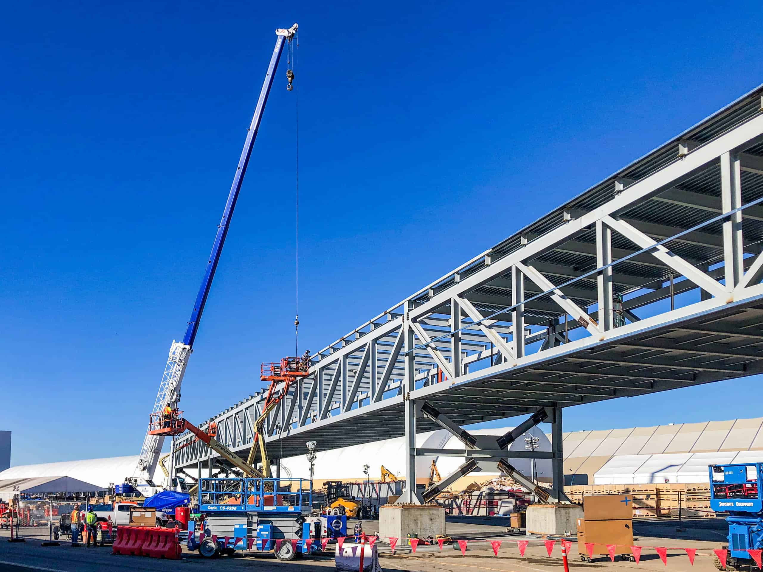 JE Dunn constructed a 25,000 square feet elevated, enclosed bridge structure for manufacturing line conveying equipment. The fully enclosed structural steel conveyance platform spans nearly 600 feet to connect two existing manufacturing buildings and was constructed in three phases. Construction took place on an occupied campus with active semi-truck and forklift traffic and adjacent to buildings housing 24/7 production lines. Careful planning and close coordination with the owner occurred months in advance to create a logistics plan that took construction space requirements and manufacturing production impact mitigation into consideration.