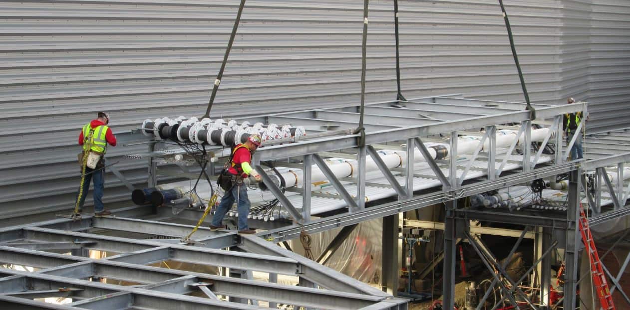 Simply put, on a recent semiconductor project, JE Dunn utilized OSM to create a safer working environment while meeting a tight schedule. The team implemented OSM on two sets of mechanical/electrical pipe trestles that spanned high above the manufacturing buildings. The trestles contained significant mechanical and electrical systems that were designed to be prefabricated in multiple sections in an offsite facility. Each trestle section had specially designed structural connections for quick, but safe, field installations. The mechanical and electrical systems were also specially designed to enable prefabrication, utilizing flex connectors and valves, to minimize installation time. Once the trestle sections were complete, they were hoisted into their final location and successfully installed.