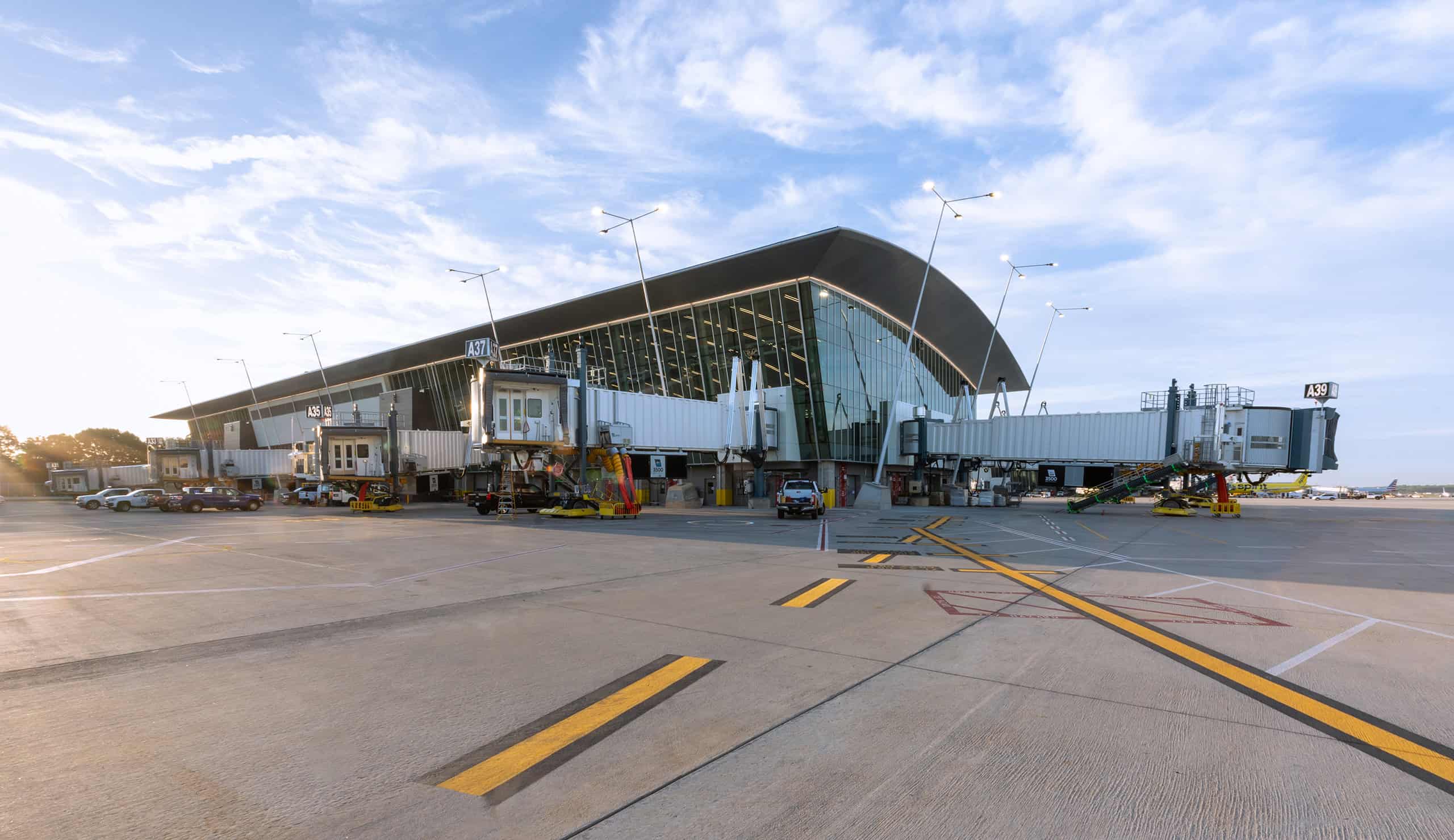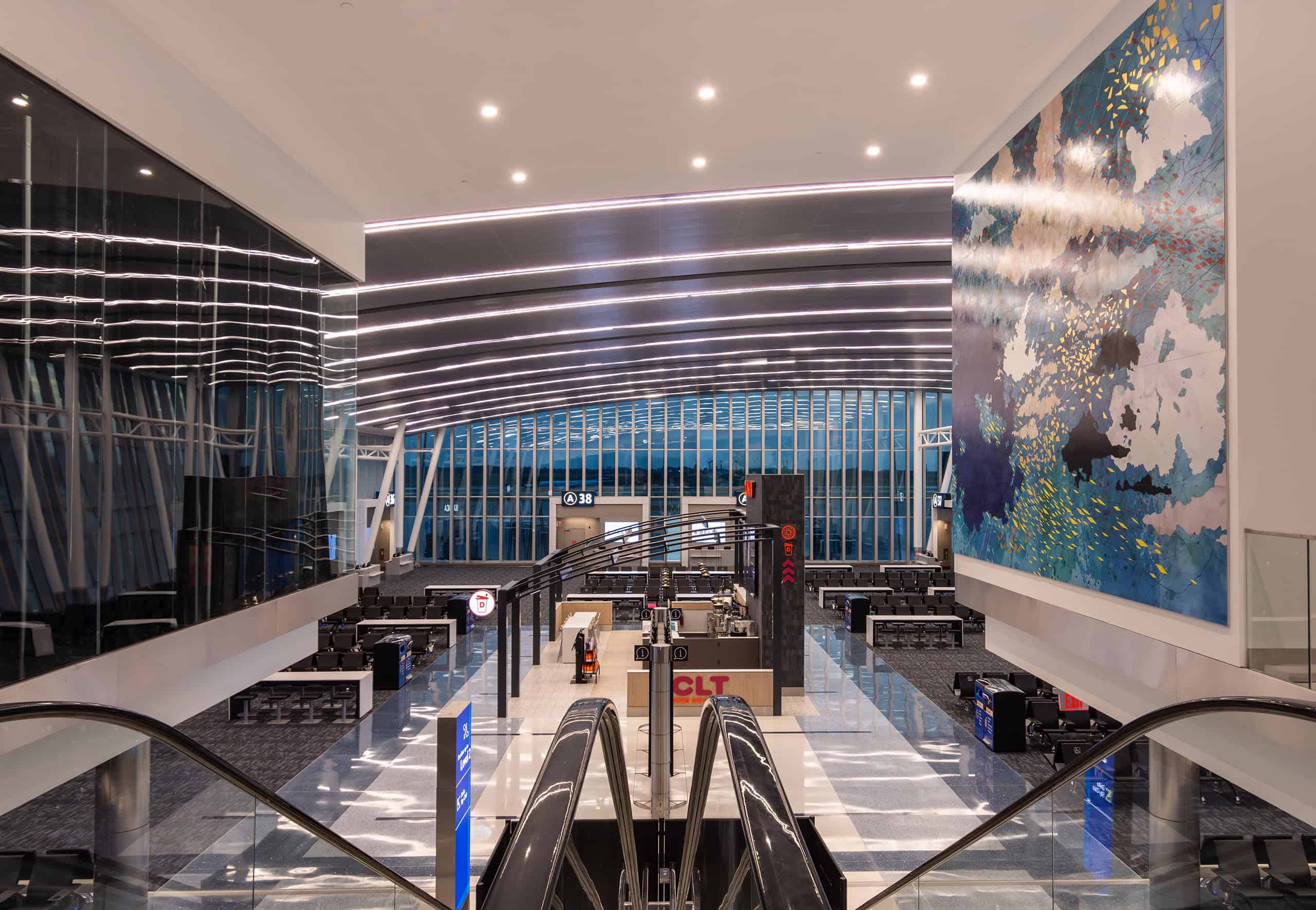 A custom terrazzo floor showcases a bronze outline of a life-size plane, while displays celebrate North Carolina’s aviation legacy, highlighted by an immersive “First in Flight” light and sound wall. A life-sized DC-9-82 T-Tail aircraft is embedded in the floor near Gate A31, adding to the visual experience.