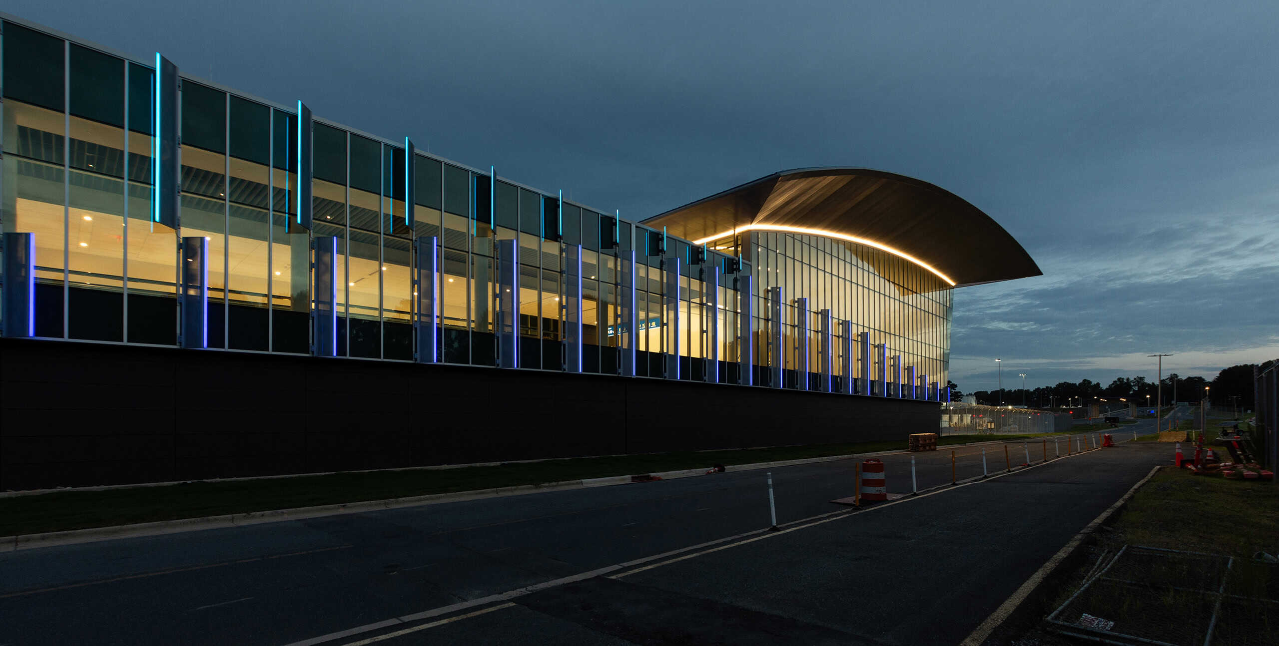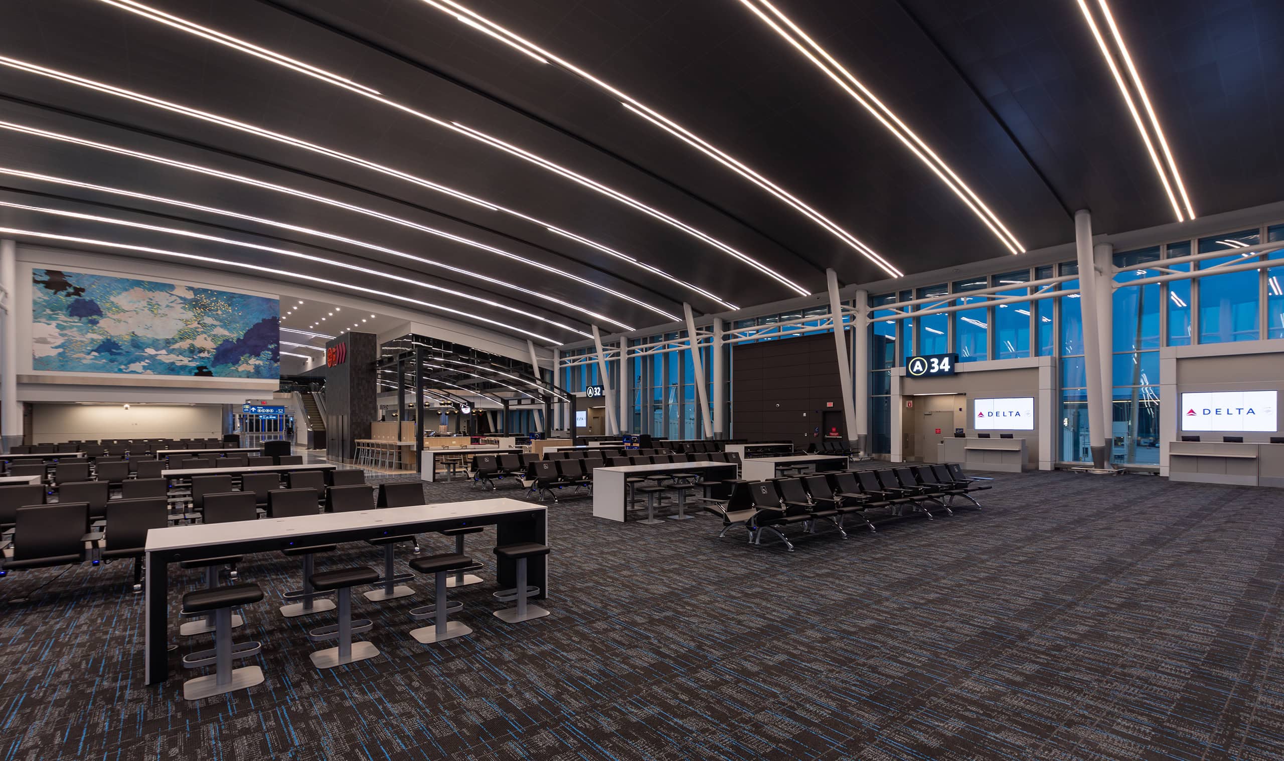 The new two-level concourse features ten gates and an upgraded baggage handling system that integrates with the existing system. Passengers benefit from an 825-foot connector equipped with moving sidewalks. The glazing system features 600 pieces of glass, each with a low-voltage driver that automatically adjusts during peak sunlight.