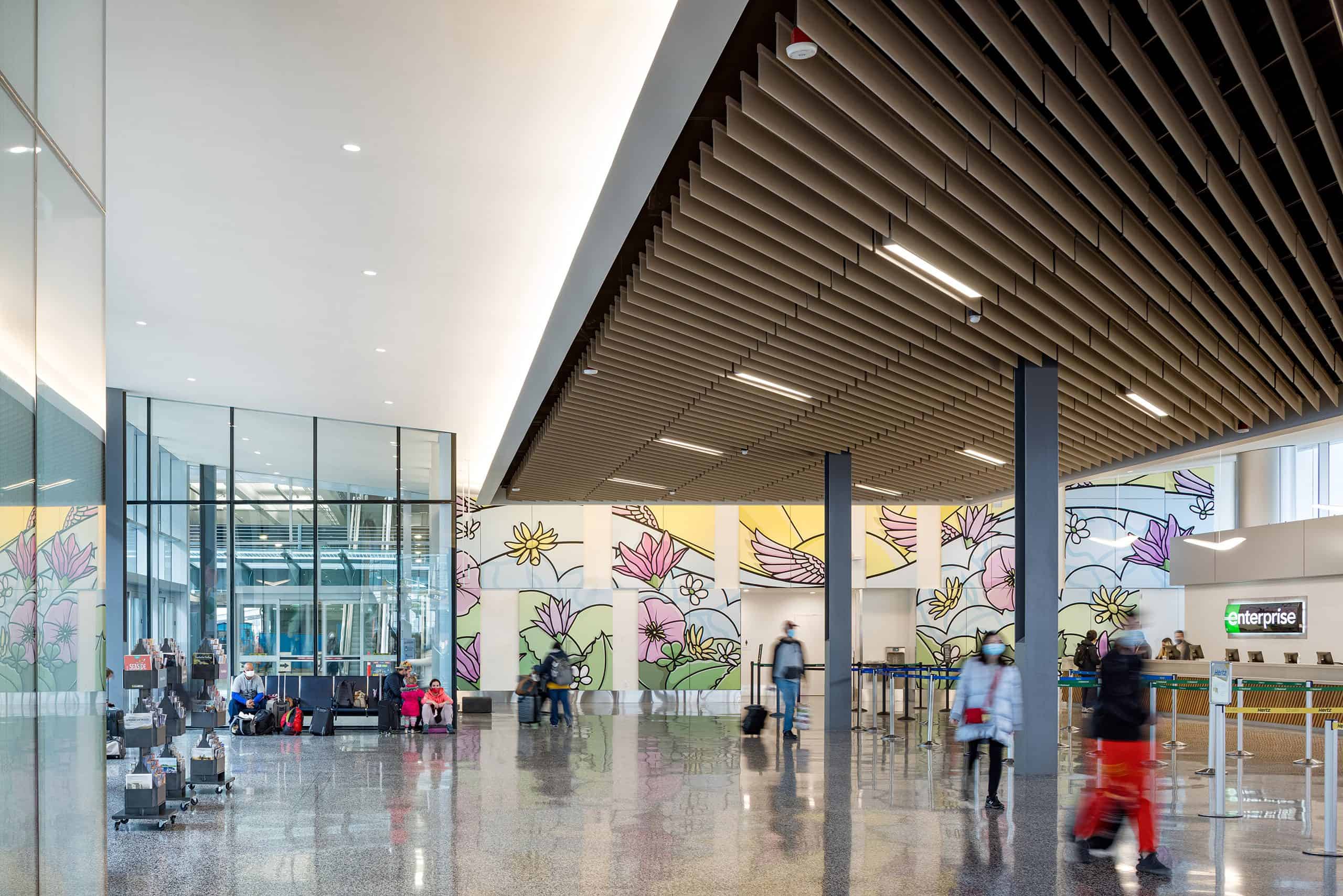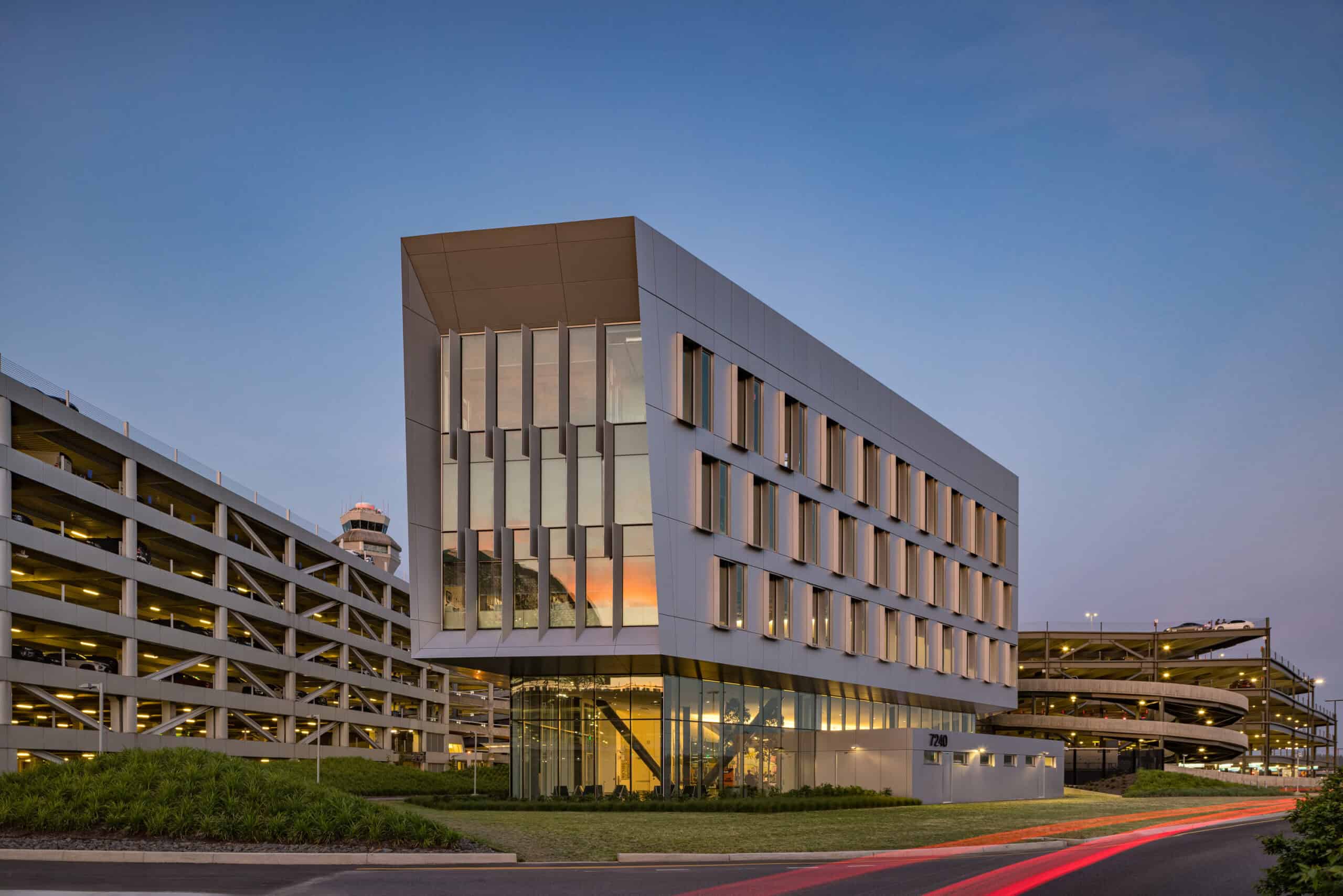 This progressive design-build project with Integrus Architecture included a new six-level parking structure, a new 90,000-square-foot airport operations center with a retail rental car center on the ground floor, and an on-grade connection building providing pedestrian access from the terminals south tunnel to the new rental car center and office building.