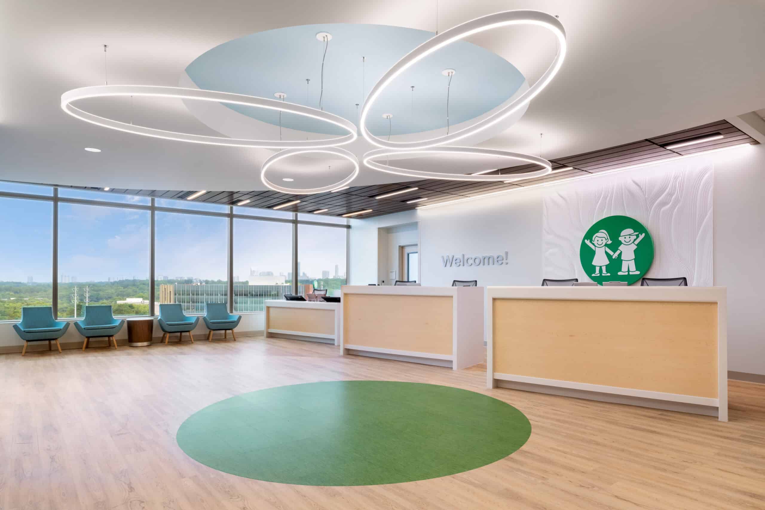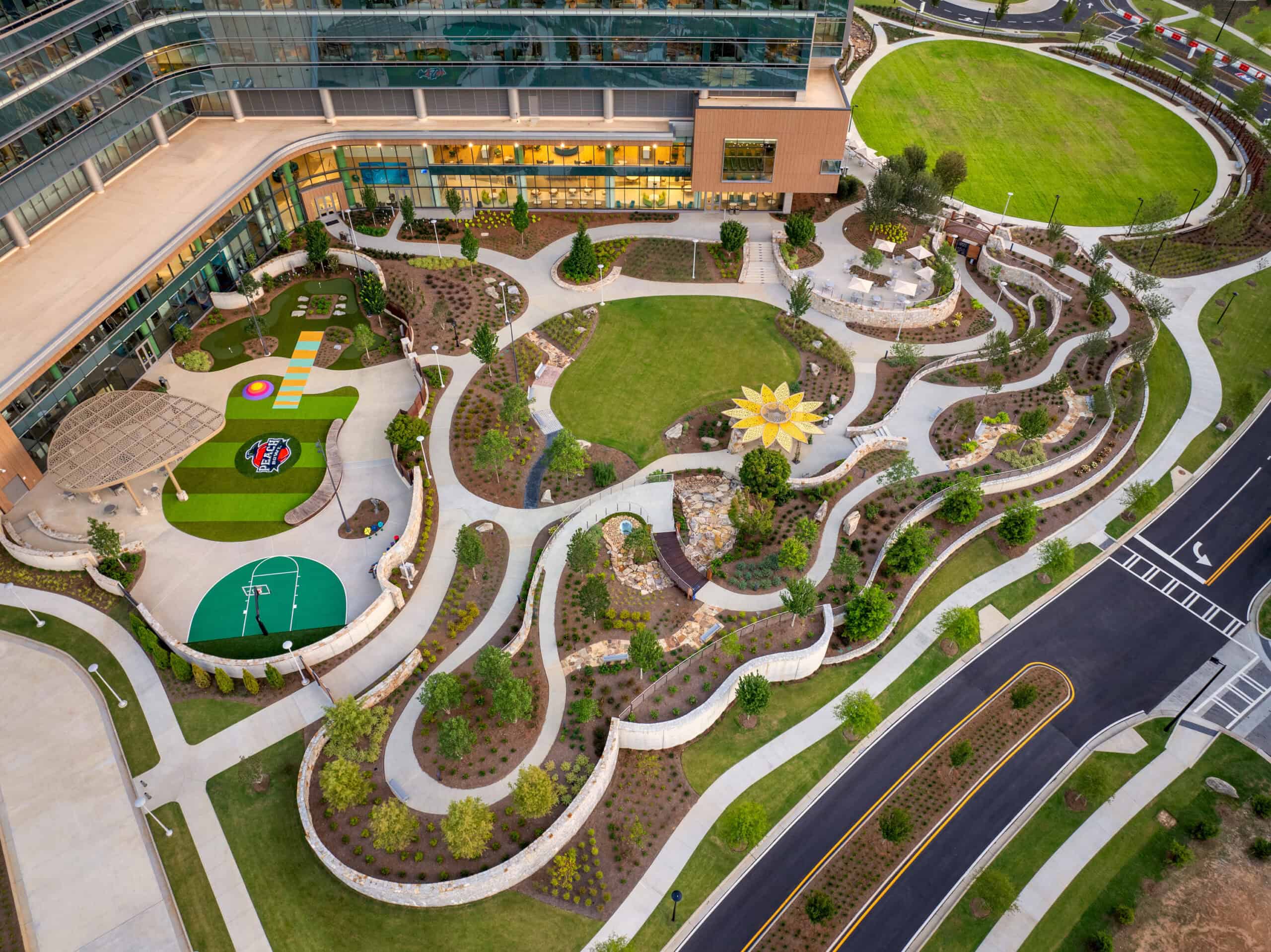 The project also included comprehensive site development across the 70-acre campus, featuring over 20 acres of greenspace, healing gardens, walking trails, water features, and extensive landscape and hardscape work. JE Dunn’s contributions were instrumental in creating a modern, patient-centered pediatric healthcare environment.