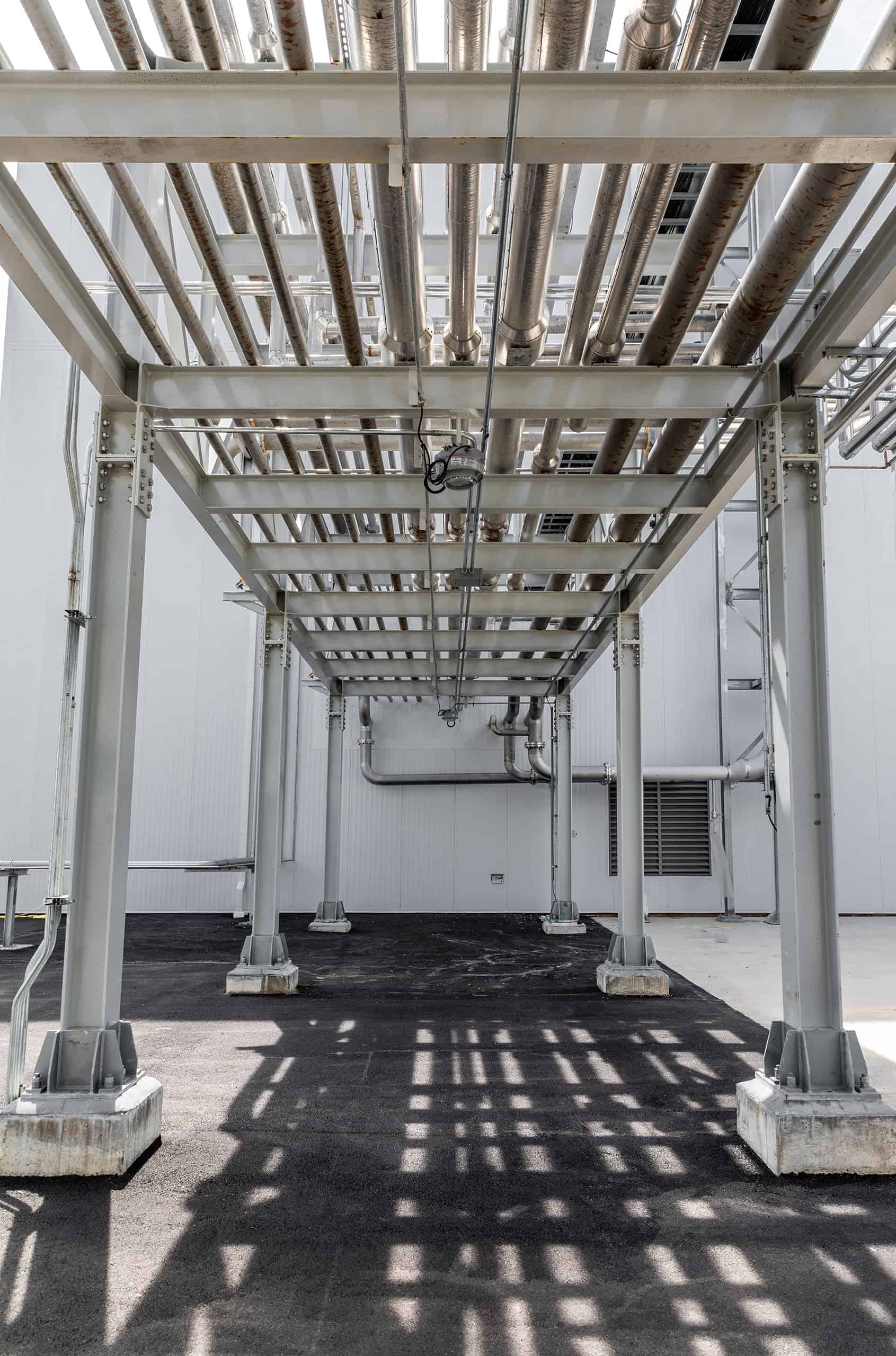 One of the primary challenges was the decision to leave the roof off the process area to accommodate the installation of the four-story production platform. This required temporary measures to protect the interior office and warehouse spaces from weather-related damage. JE Dunn’s Heavy Equipment Solutions team used a 650-ton crane with 263 feet of boom to set the massive modules, ensuring ground stability with the help of geotechnical engineers. The team also utilized smaller, more mobile cranes for setting structural steel, smaller equipment, and process piping.