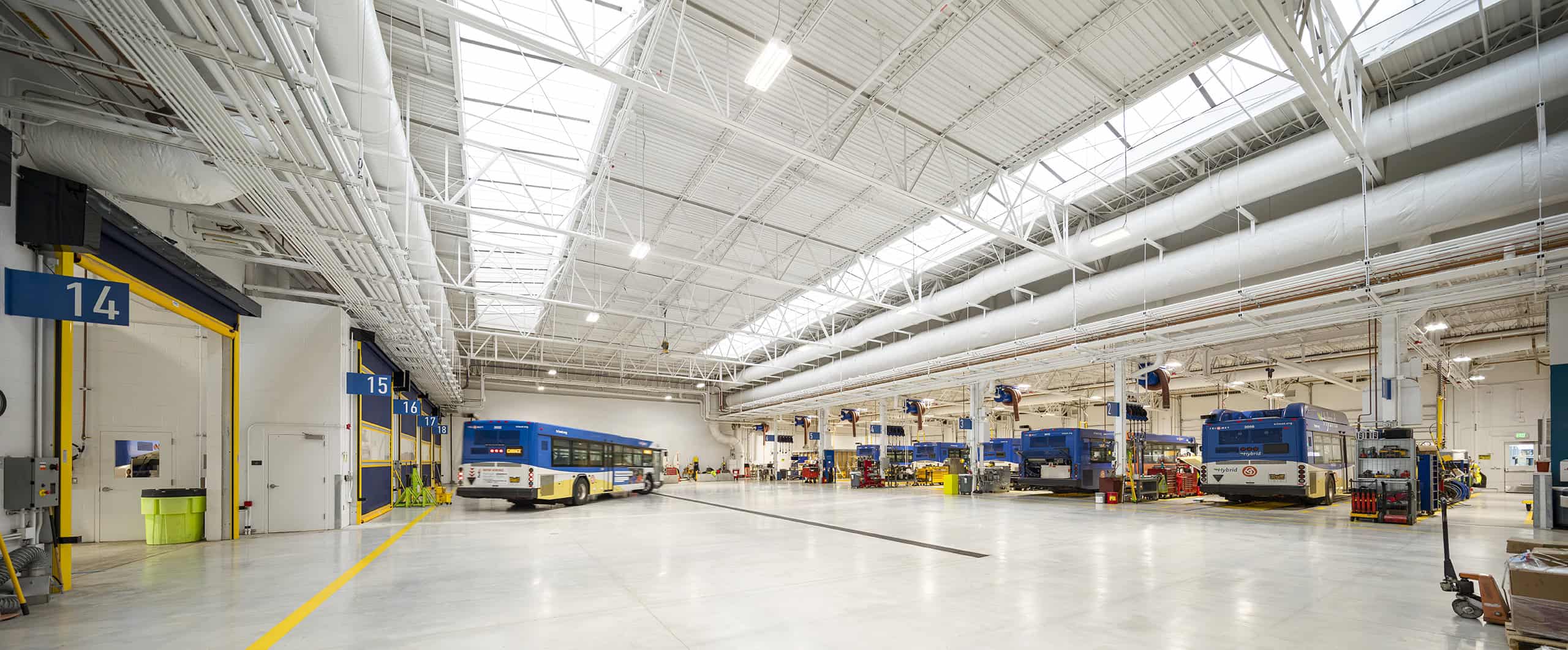 The second phase of the build more than doubled the original bus maintenance area. The facility now houses 22 bus maintenance bays, and a new 400,000-square-foot concrete-paved bus yard which can accommodate over 300 buses.