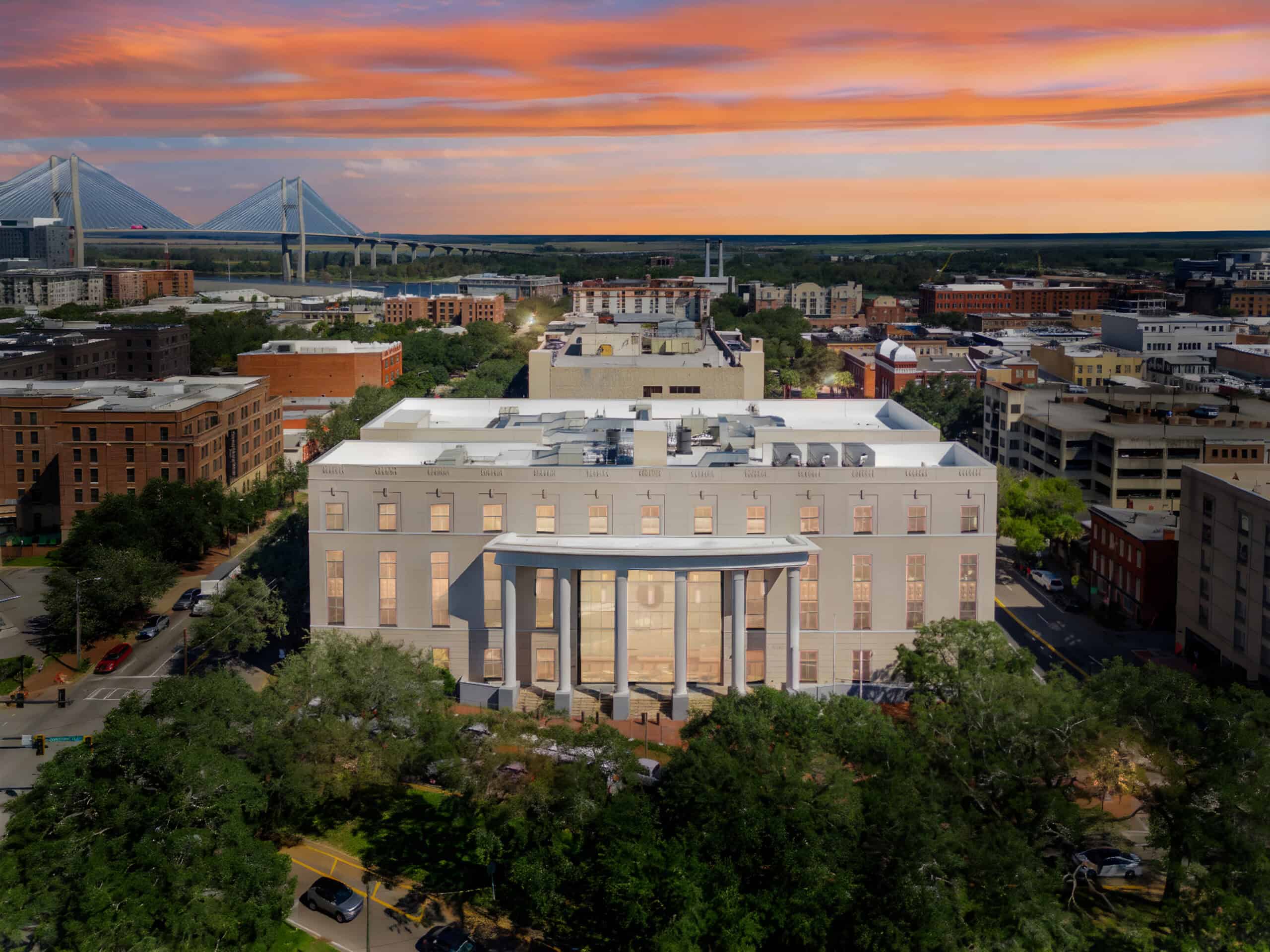 The new Chatham County Courthouse includes 155,000 square feet of new construction and 2,500 square feet of renovation. The facility is a four-story concrete and steel structure with architectural precast façade, and includes a basement and two new tunnels that connect the existing courthouse and the new courthouse.