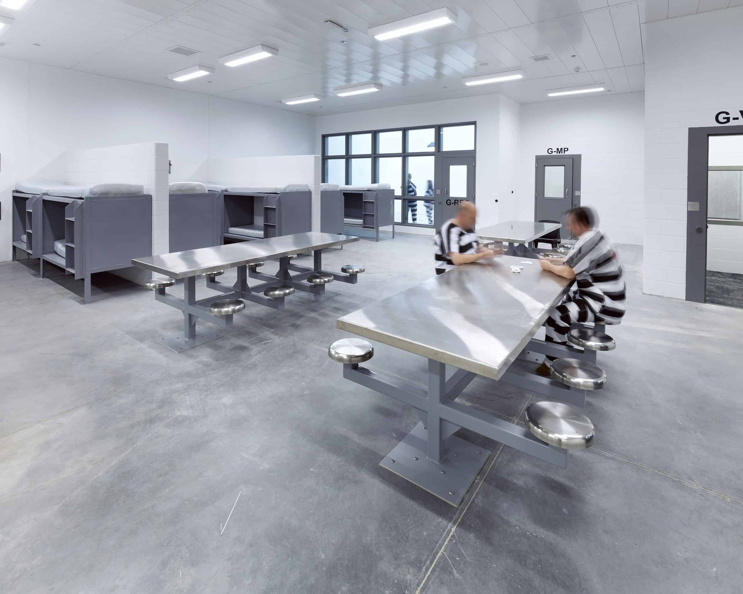 The main housing unit for inmates consists of 12 pods with 56 beds in each. Inmates on work release or work jobs inside the jail itself will be housed in four dorm-style pods with 24 people in each, and a second dorm of four pods with 50 beds each. The dorm style housing is a cost-effective approach to increase bed count. The building includes 16 video court booths, a dedicated space for inmates to attend virtual court hearings, which alleviated a budget concern of Greene County to bus inmates to their downtown courts.