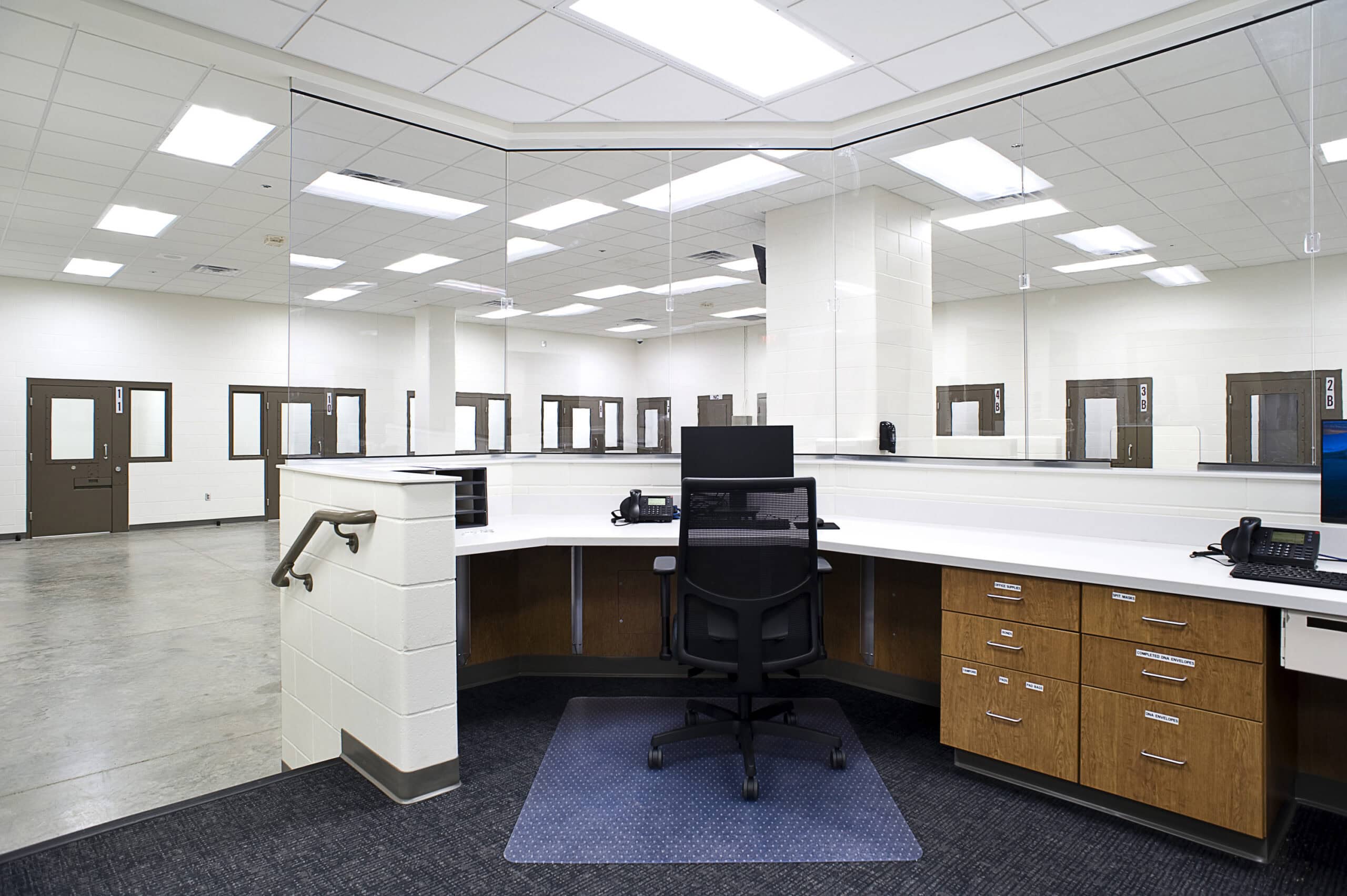 The addition creates first floor administrative services space for the jail staff, local and county police forces, and judicial branch. A 1,500-square-foot courtroom allows for in-house sentencing. The space also includes offices, conference rooms, roll-call meeting room, locker rooms, catering kitchen break room, public lobby and visitation space, and an outdoor patio. A vehicle sally port, intake area, 60 bed transitional housing, inmate recreation areas, and officer control areas are included on the new first floor. The Master Control Room was relocated to the new addition and will serve both the new facility and the existing building.
