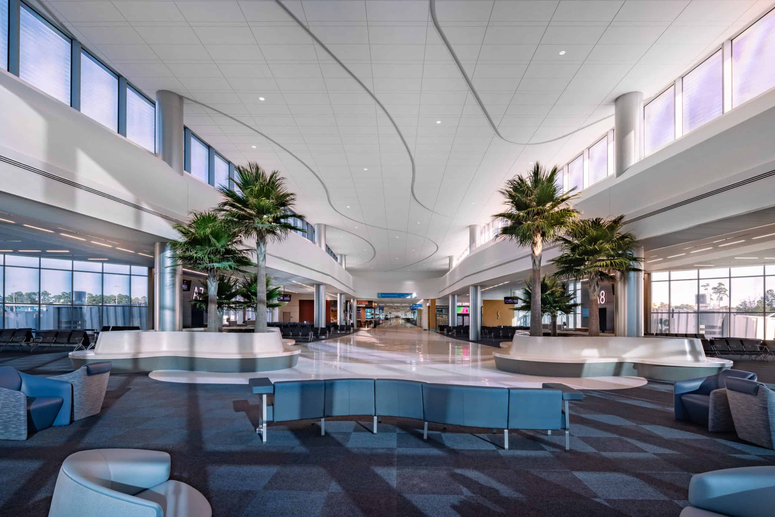The project’s primary architect Brad Sucher, Senior Vice President with Gresham Smith, offered additional examples about how these design choices are ultimately in service of the passenger experience. “A couple of things I really like about this facility…you’ve got all this natural light pouring in, and there’s a clear line of sight all the way back into the existing [structure], including baggage claim and the exit lane. And as you get closer to this glass, one thing you may notice is…we actually mitigated the glare through electrochromic glazing. This ensures the passenger doesn’t get all that glare into their eyes, but it still provides that open view out to the airfield. As a plane goes by right now, you almost feel like you can reach out and touch [it].