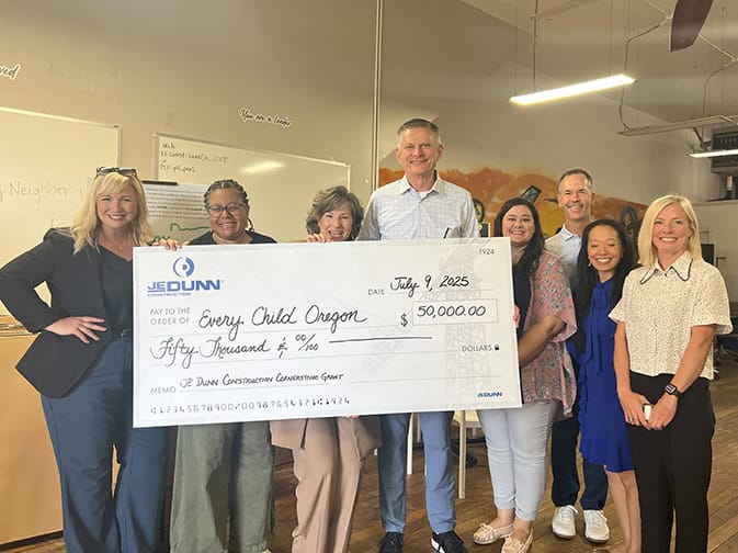 JE Dunn awarded two grants totaling $150,000 to Portland-based nonprofits, Every Child PDX and Project 48. These grants are part of JE Dunn’s 2025 Cornerstone Campaign, a new community impact initiative, which focused on “Access to Safe and Supportive Spaces for Kids in Need.” This focus was selected by an employee vote earlier this year.