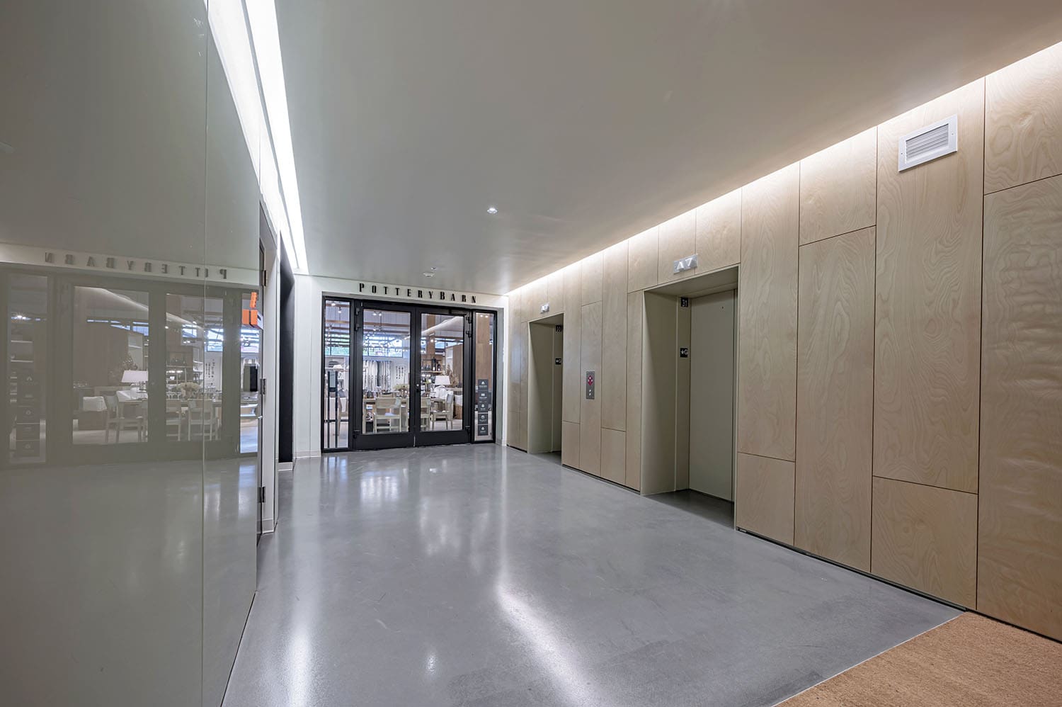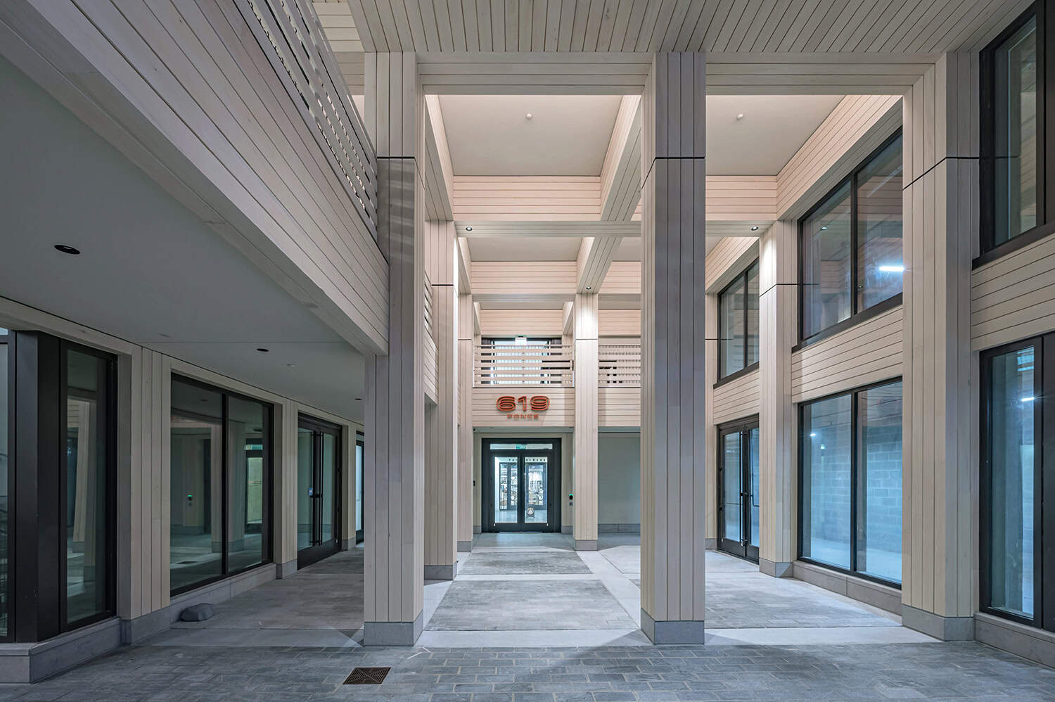 Community Connectivity: 619 Ponce Mass Timber office is one-third of the Ponce City Market Campus Upgrades build. The office building is seamlessly linked to the Scout Living project through a thoughtfully designed courtyard that separates the two buildings. On the lower-level connectivity to Ponce City Market itself can be found through the parking access with direct-to-space elevator and stair access. Rideshare drop-off spots were also implemented and bike parking for commuters.