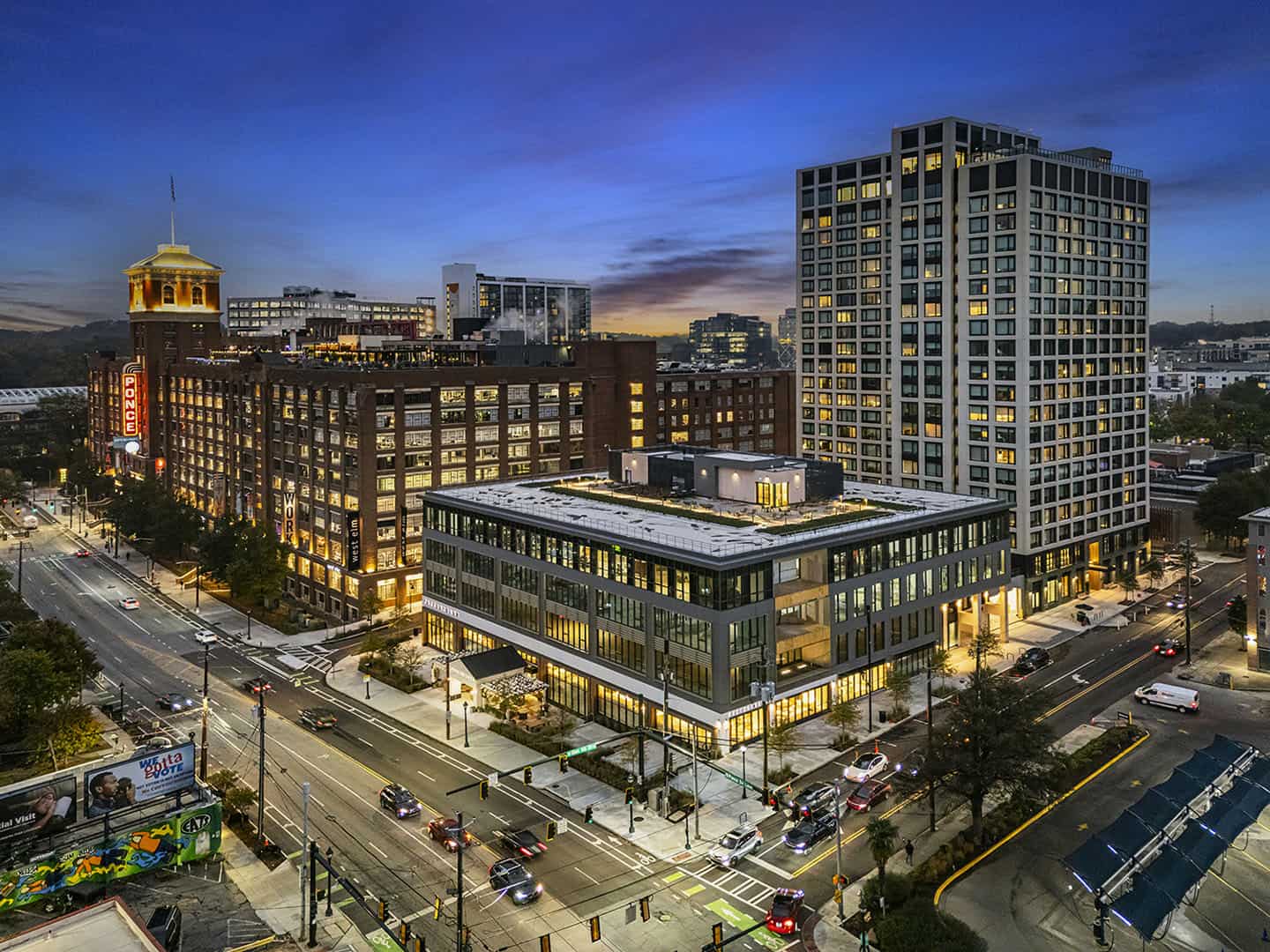 The 619 Ponce mass timber office is a cornerstone of the Ponce City Market campus upgrades, alongside Scout Living and Signal House. This sustainable urban oasis sets a new standard for eco-conscious building in Atlanta.